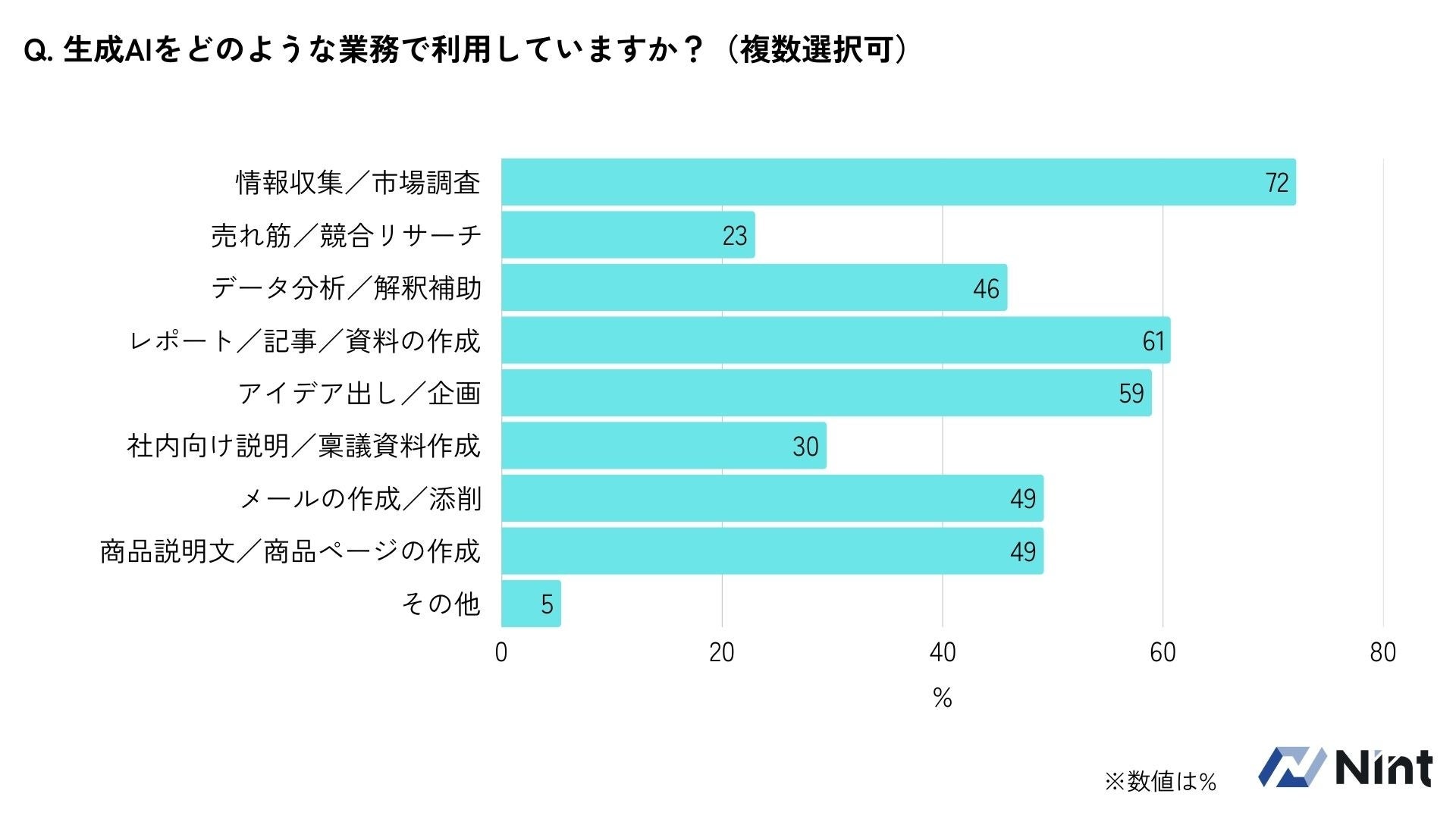 国内3大ECモール(楽天市場・Amazon・Yahoo!ショッピング)の公開データを収集・分析するクラウドサービス「Nint ECommerce」を提供している株式会社Nint(本社:東京都新宿区、代表取締役:吉野順子、以下「Nint」)は、EC事業に携わる担当者を対象に、生成AI(ChatGPT、Gemini、Claude 等)の業務利用実態と課題に関するアンケート調査を実施しました。
