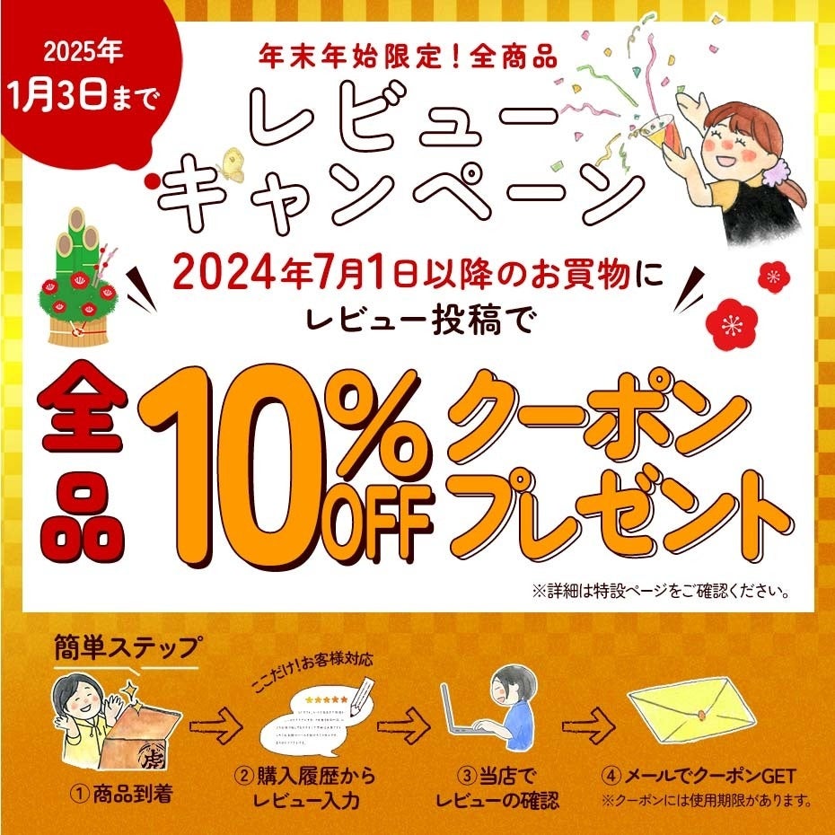 竹虎楽天店では年末年始限定!「全商品レビューキャンペーン」を2024年12月11日(水)朝10時から2025年1月3日まで開催!レビュー投稿で店内全品10%OFFクーポンをプレゼントいたします。