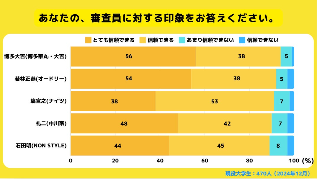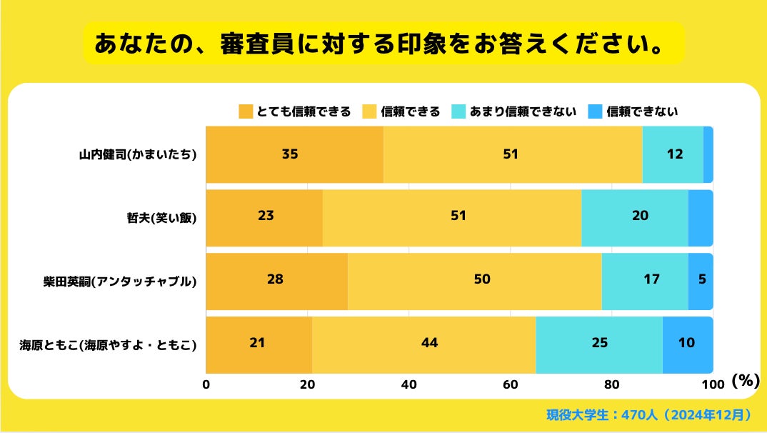 集計からは、芸歴が長く、実績や露出度に応じて「信頼されている」結果が確認できます。「信頼できない」が過半数に達している審査員は一人もおらず、人選に関しては一定の評価を受けているようです。
