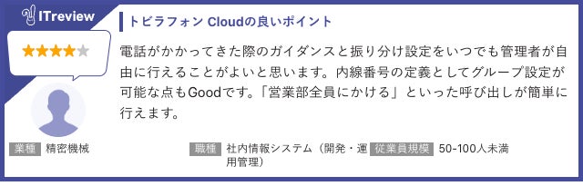 「トビラフォン Cloud」は「ITreview」で平均顧客満足度4.2を獲得しています(2025年4月16日時点 83レビュー)。当製品のご利用者様から実際に寄せられたレビューを一部ご紹介します。
