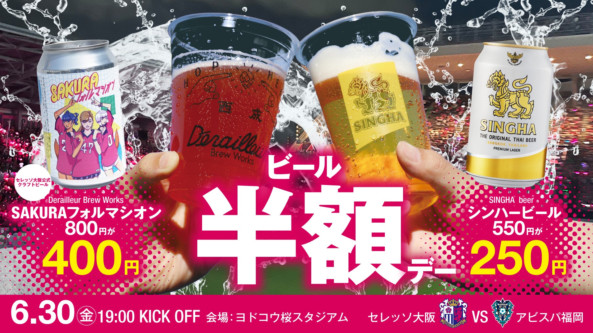 セレッソ大阪では、6/30(金)福岡戦にてビール半額デーを実施いたします。