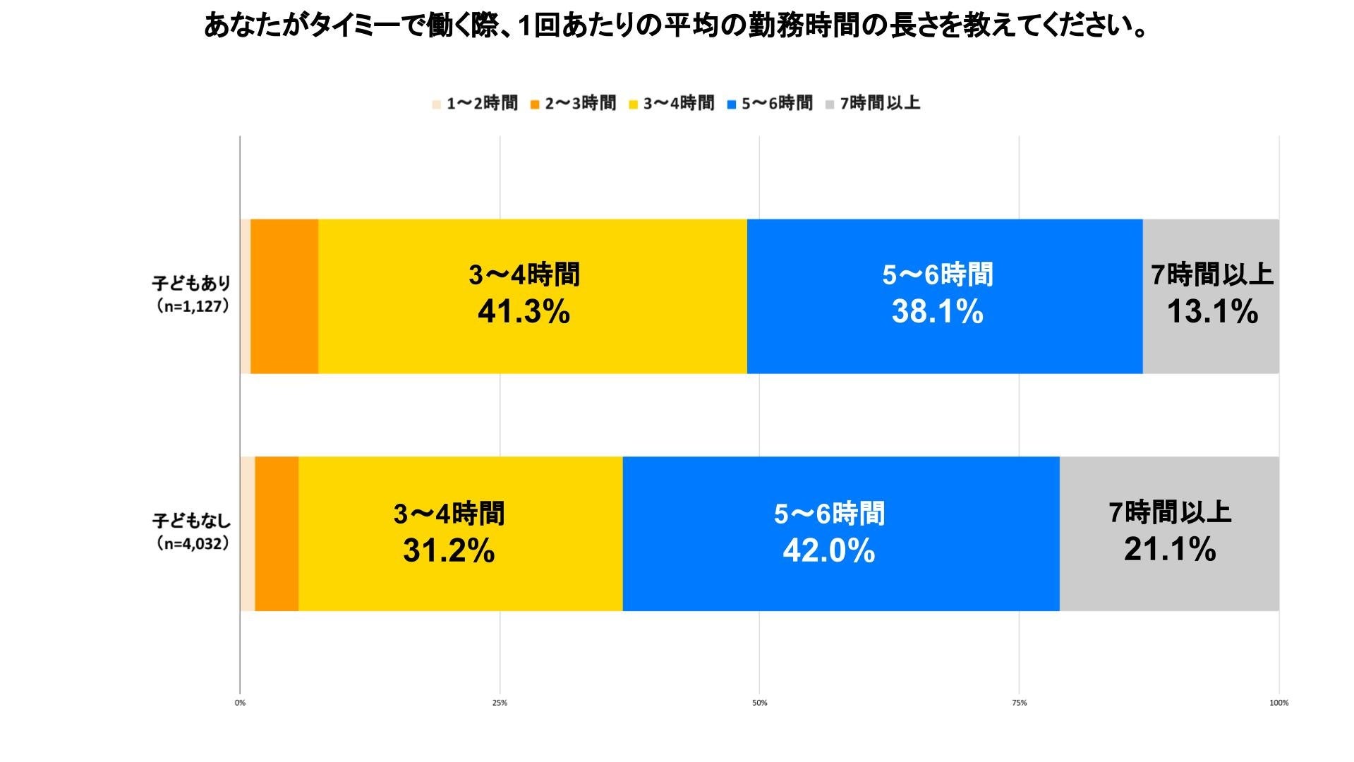 また、1回あたりの勤務時間の長さについて、子育てをしているワーカーの1回あたりの勤務時間は平均3〜4時間(41.3%)が最も多い一方、子育てをしていないワーカーは平均5〜6時間(42.0%)が最も多く、子どもの有無で若干傾向が異なることがわかった。また、7時間以上の勤務時間で比較すると子育てをしているワーカーは13.1%である一方、子育てをしていないワーカーは21.1%と8ポイントの差があった。