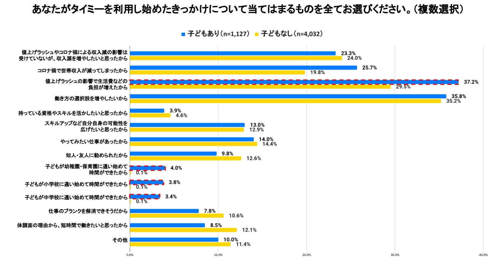 ・子育てをしているワーカーがスキマバイトを始めた時期は、2022年が69.5%と最も多かった。スキマバイトを始めたきっかけとして最も多く回答されたのは、「値上げラッシュの影響で生活費などの負担が増えたから」(37.2%)であり、子育てをしていないワーカーの回答(29.5%)と比較すると7.7ポイント高かった。