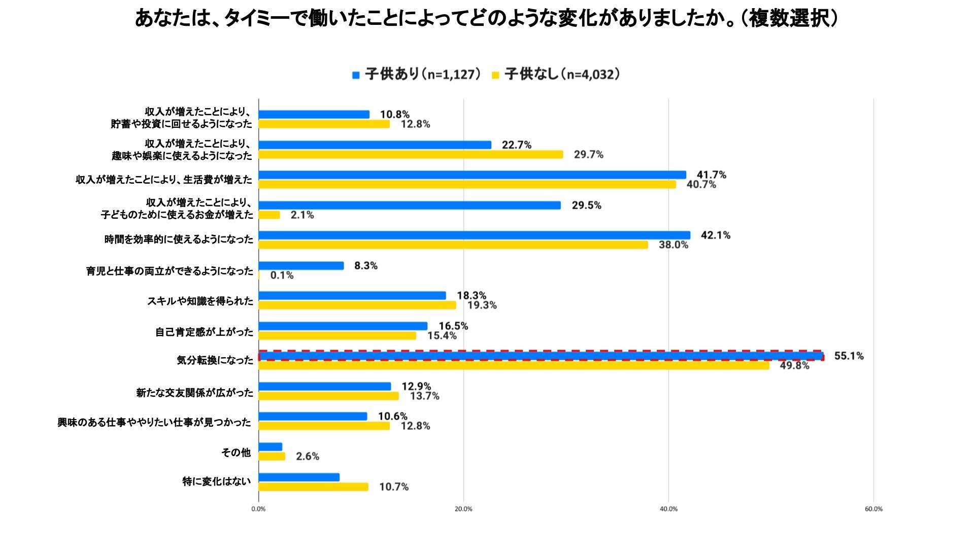 タイミーで働いたことによる変化を問う設問では、子育てをしているワーカーの半数以上が「気分転換になった」と回答しており、子育てをしていないワーカーと比較すると5.3ポイント高い。