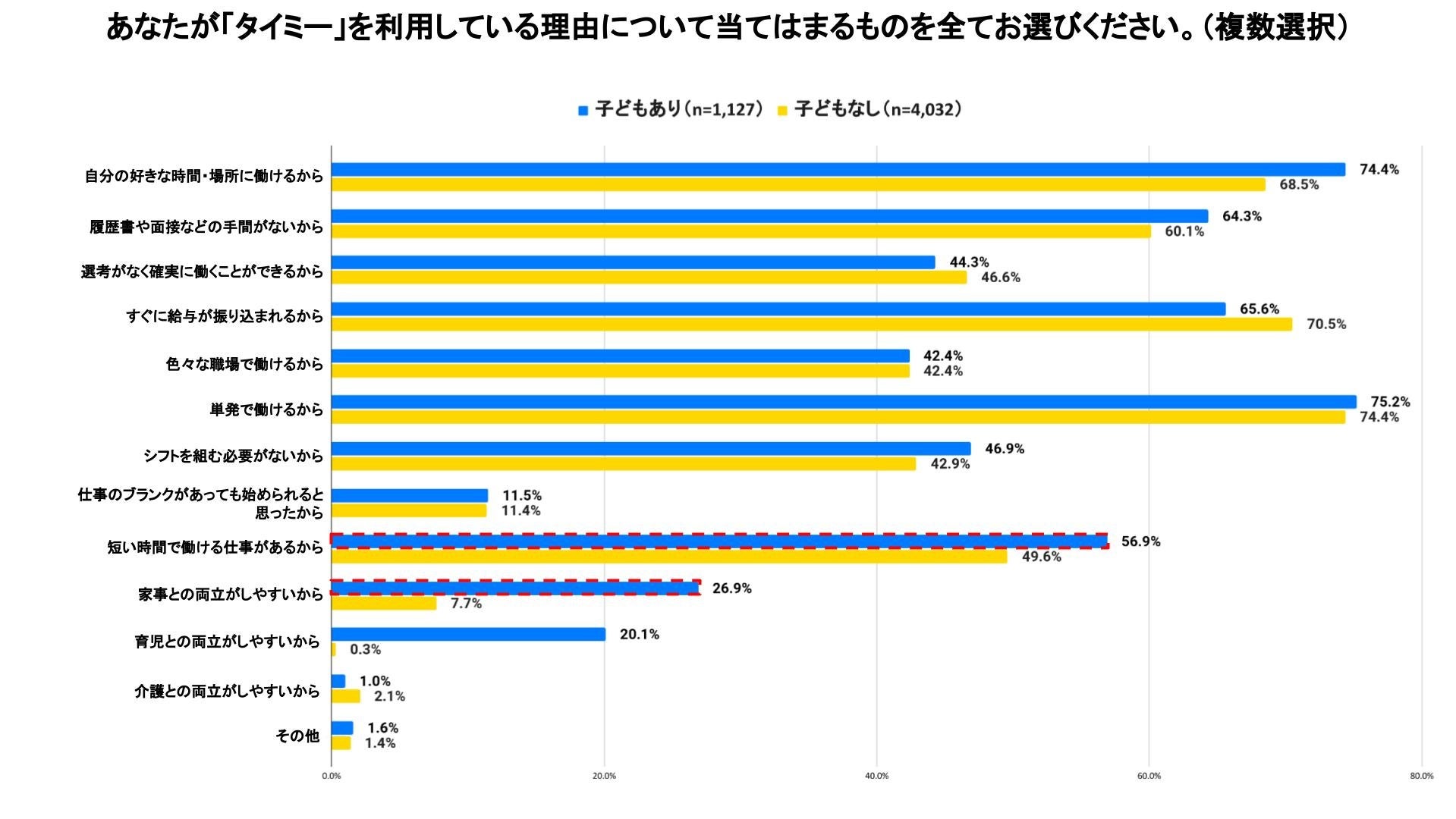 子育てをしているワーカーはもちろん、子育てをしていないワーカーも、スキマバイトで働く理由に「自分の好きな時間・場所で働ける」ことや「単発で働ける」ことを挙げている。一方で「短い時間で働ける仕事がある」、「家事との両立がしやすい」の回答については、いずれも子育てをしているワーカーの方がより多く回答しており、家事や育児と両立しながら短いスキマ時間で働きたいというニーズをスキマバイトで叶えることができていることが判明した。