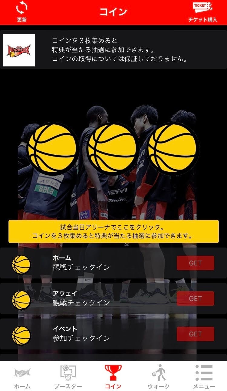 ①ホーム・アウェー関わらずアリーナにチェックインをして頂くとコインが1枚GET出来ます。
