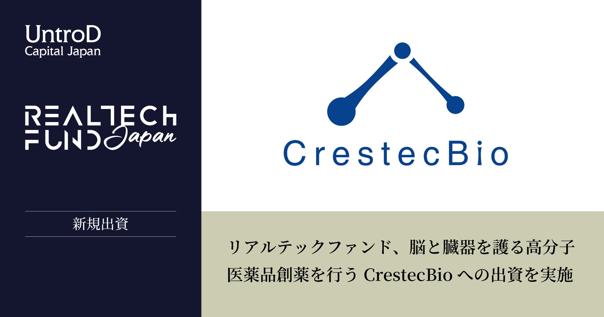 UntroD Capital Japan株式会社(所在地:東京都港区、代表:永田 暁彦)が運営するリアルテックファンド* は、高分子医薬を用いた脳・臓器の再灌流障害からの神経保護薬開発を目指すCrestecBio株式会社(本社:茨城県つくば市、代表取締役:丸島愛樹、以下「CrestecBio」)へ投資を実施したことをお知らせ致します。CrestecBioは今回の調達資金をもとに、急性期脳梗塞における脳動脈閉塞の再開通に伴う神経障害(以下「再灌流障害」)からの保護薬「CTB-211」の開発を進めていく計画です。