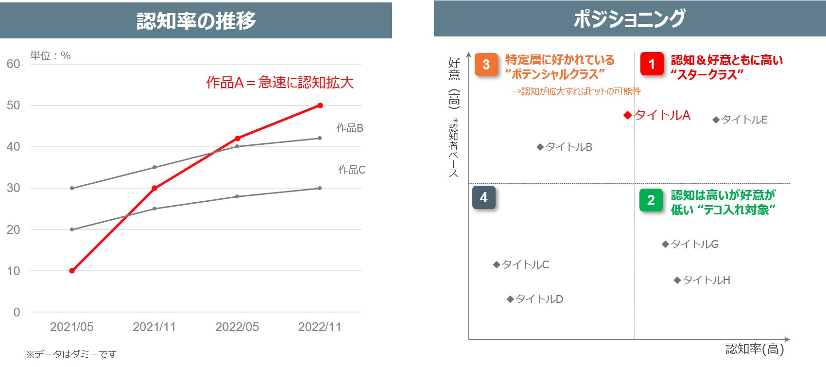 浸透状況やその時系列推移、また作品同士の相対的なポジショニングを捉えることで、生活者の中で注目が集まっている作品の動向把握が可能です。自社IPの評価やコラボ先IPの検討にご活用いただけます。