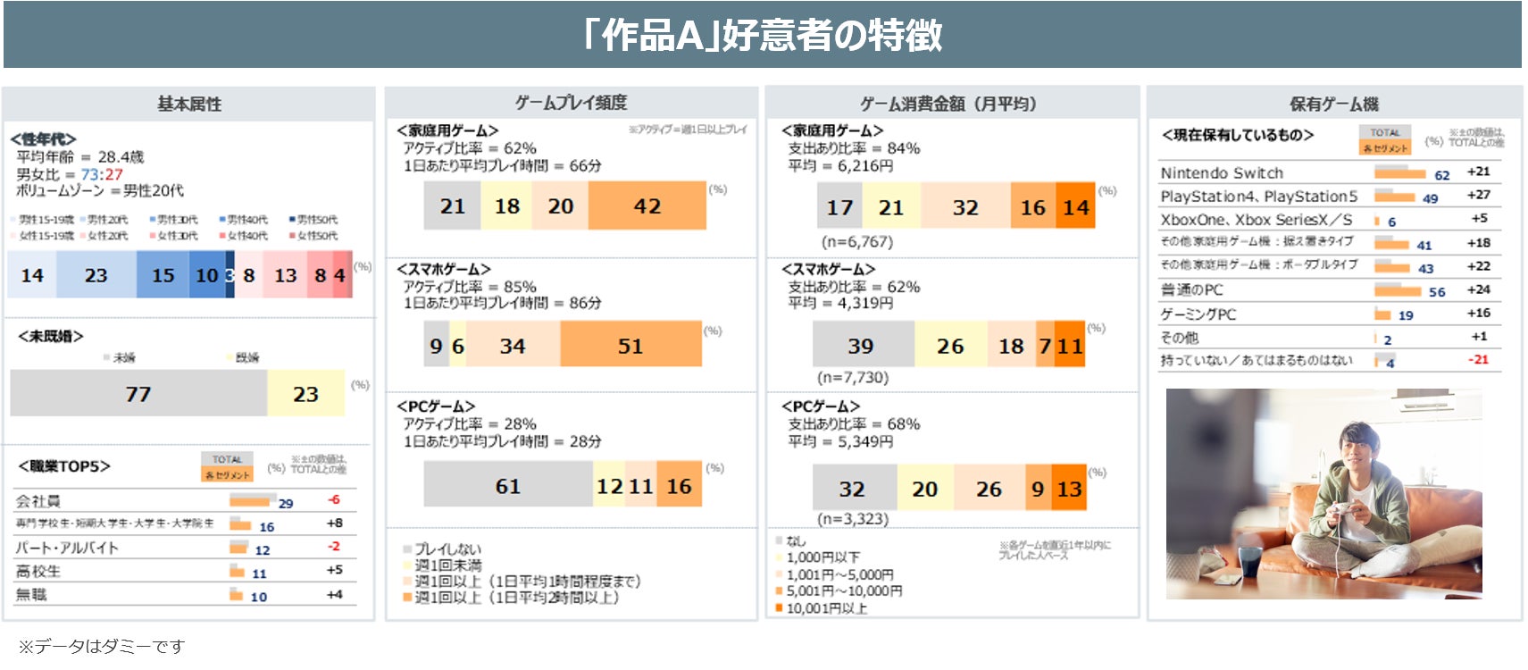 各IPファン・ユーザーのデモグラ、ゲームプレイ実態、ゲーム価値観などが把握できます。特徴を捉えることで、ターゲット戦略にご活用いただけます。