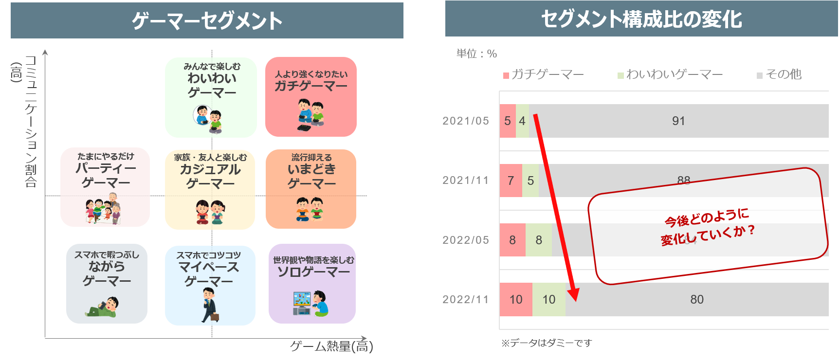ユーザーの意識を基にした「ゲーム熱量」と、「コミュニケーション割合」を軸に、独自のセグメントを設定。今の時代におけるゲーム市場の変化を捉えます。