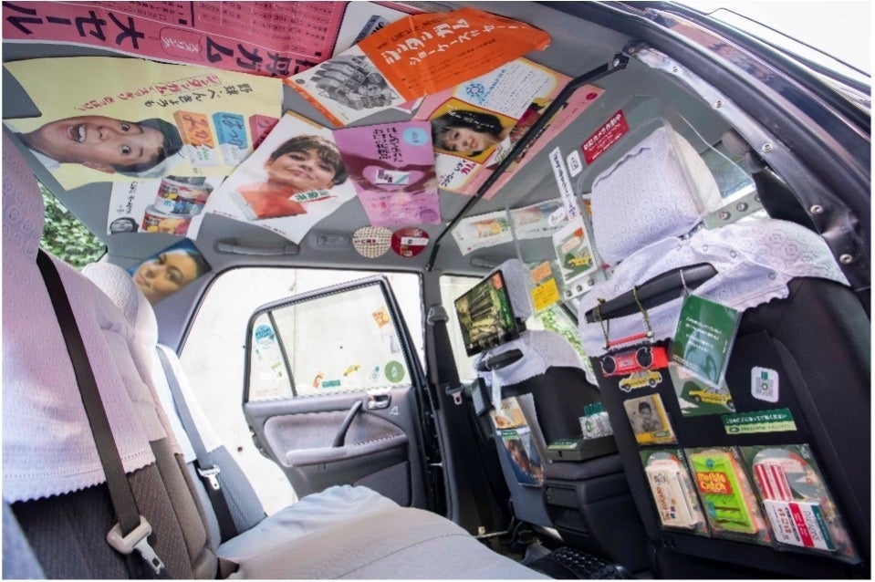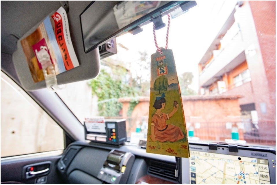 フルラッピング車両1台は、昭和時代のタクシーの定番である「トヨタ クラウン」を採用し「銀粒仁丹」のパッケージカラーである「緑」と「金」のツートンカラーのデザインを外装に施しました。車内には当時の面影が残るシートカバーやフットカバーを使用し、車内に設置したラジカセからは、昭和中期に大人から子供まで口ずさんでいたTVCMソング「仁丹の歌」が流れ、当社が昭和に発行したパンフレットや、昭和の懐かしいアイテムを車内のいたるところに設置しています。