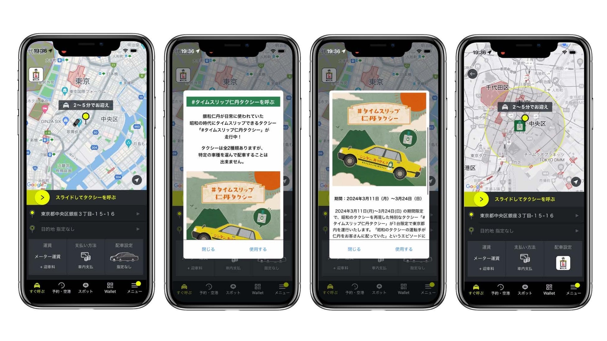 タクシーアプリ「S.RIDE」を起動し、画面左上に表示されている『#タイムスリップ仁丹タクシー』のアイコンをタップし、「使用する」を選択することで配車可能