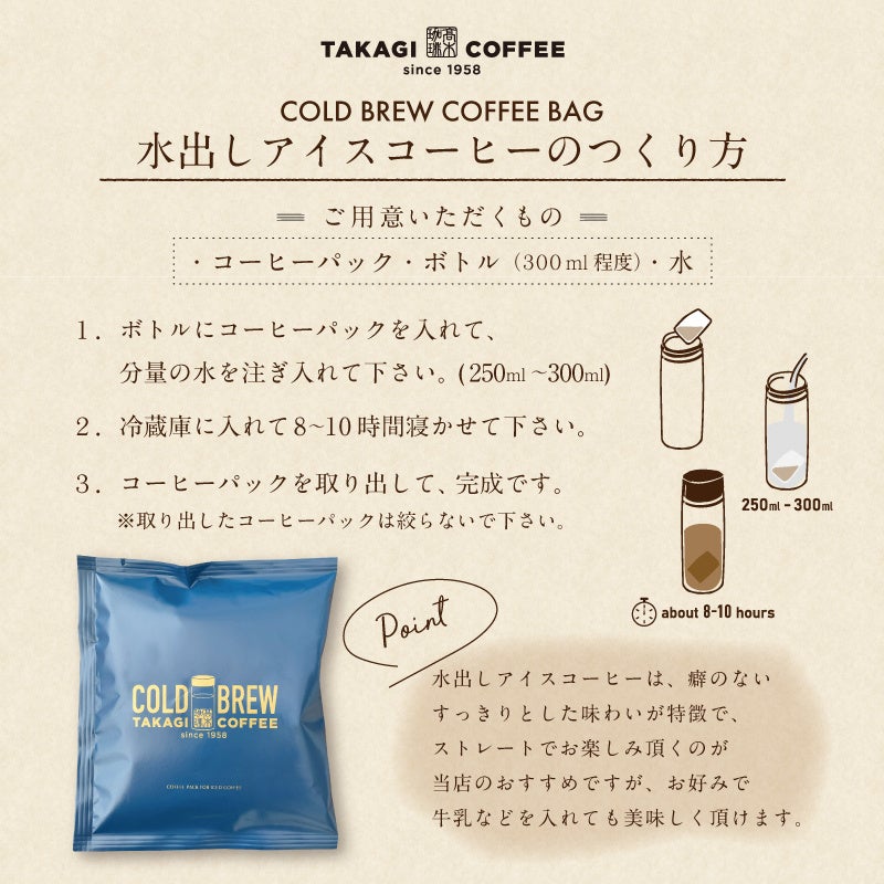国内店舗店頭と髙木珈琲オンラインショップにてコールドブリューパックも販売中です。