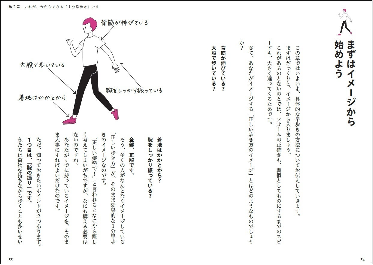 簡単なことのように思える「早歩き」ですが、腕の振り、身体の軸、足の動かし方などを意識して、正しい歩き方を習得することが大切。フォームを習慣化できれば、毎日の「ついでに1分早歩き」で、効果的な有酸素運動を無理なく自然に続けることができます。
