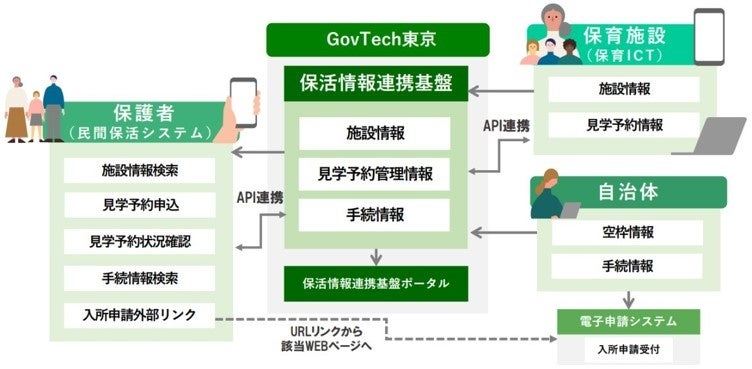 具体的には、保活に関する情報を集約した連携基盤を東京都およびGovTech東京が整備し、民間保活アプリ「えんさがそっ♪」及び保育施設の保育ICTシステムとつなぐことで、保育施設の検索や園見学の予約、入園申請をオンライン・ワンストップで行えるようにし、保活に係る保護者の負担軽減を図ります。