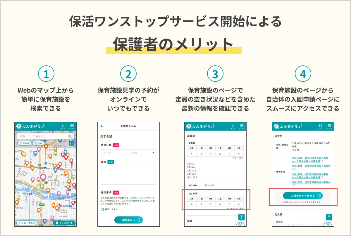 対象エリアの保護者は「えんさがそっ♪」を通じて、保育施設の検索や見学予約が簡単に行えるようになります。各施設のページでは定員の空き状況などを含めた最新の情報を確認することができ、自治体の入園申請ページにもシームレスでアクセスできるようになります。