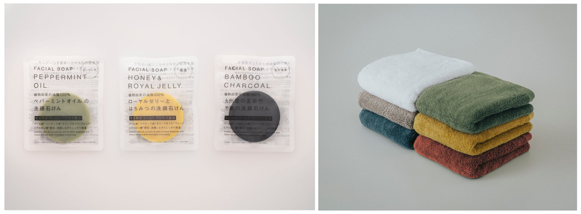 枠練り製法の「洗顔石鹸」と、使用感・環境配慮面を両立させた「フラッフィータオル」