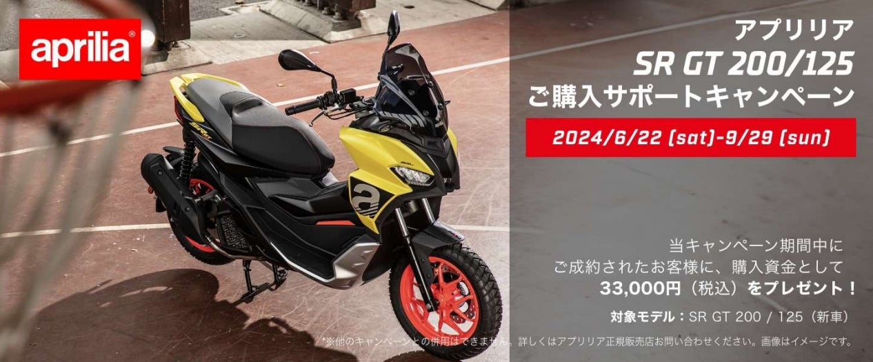 内容 : アプリリア SR GT 200/ 125の新車をアプリリア正規販売店にてご成約のお客様に、 購入資金として¥33,000(税込)をプレゼントいたします。