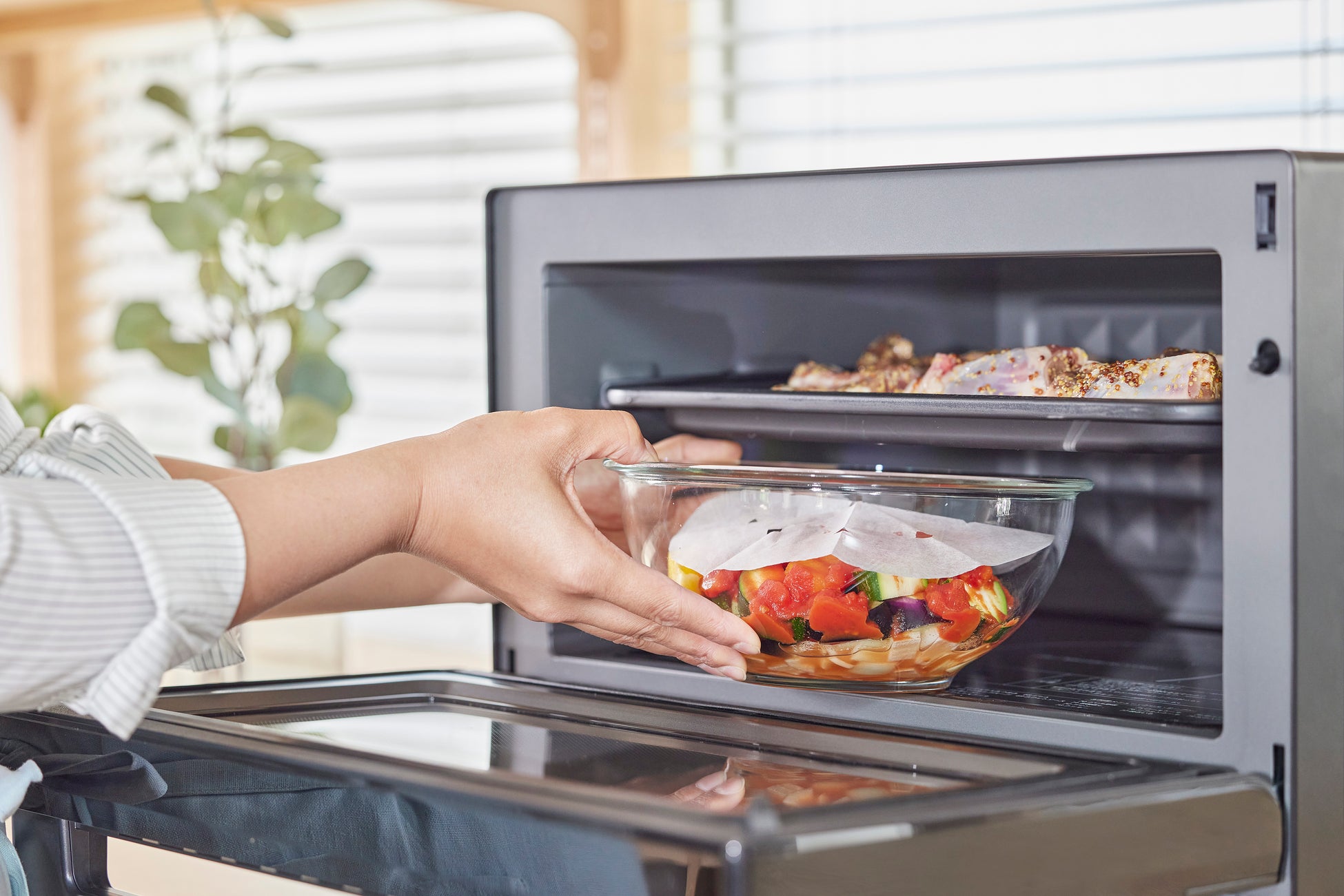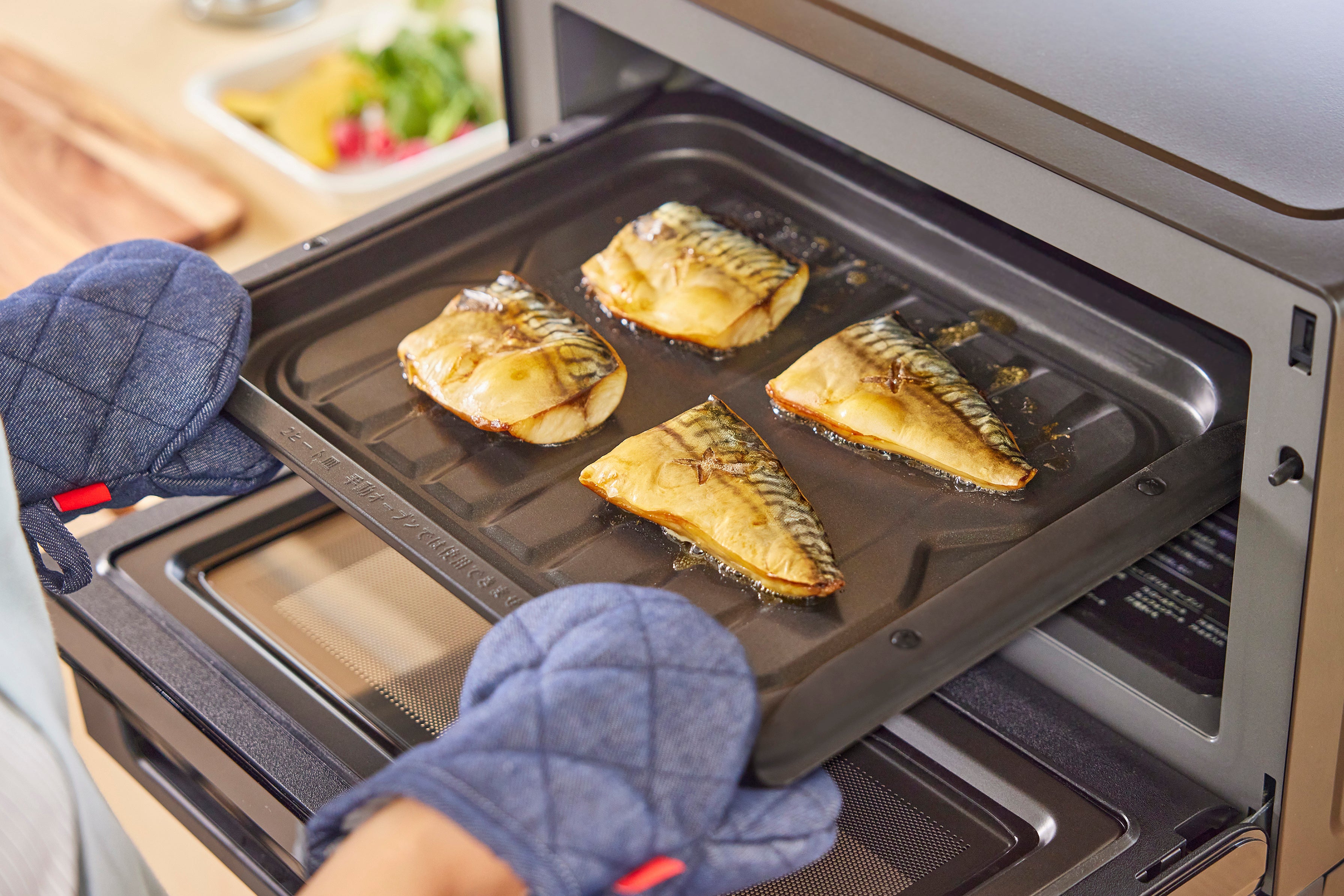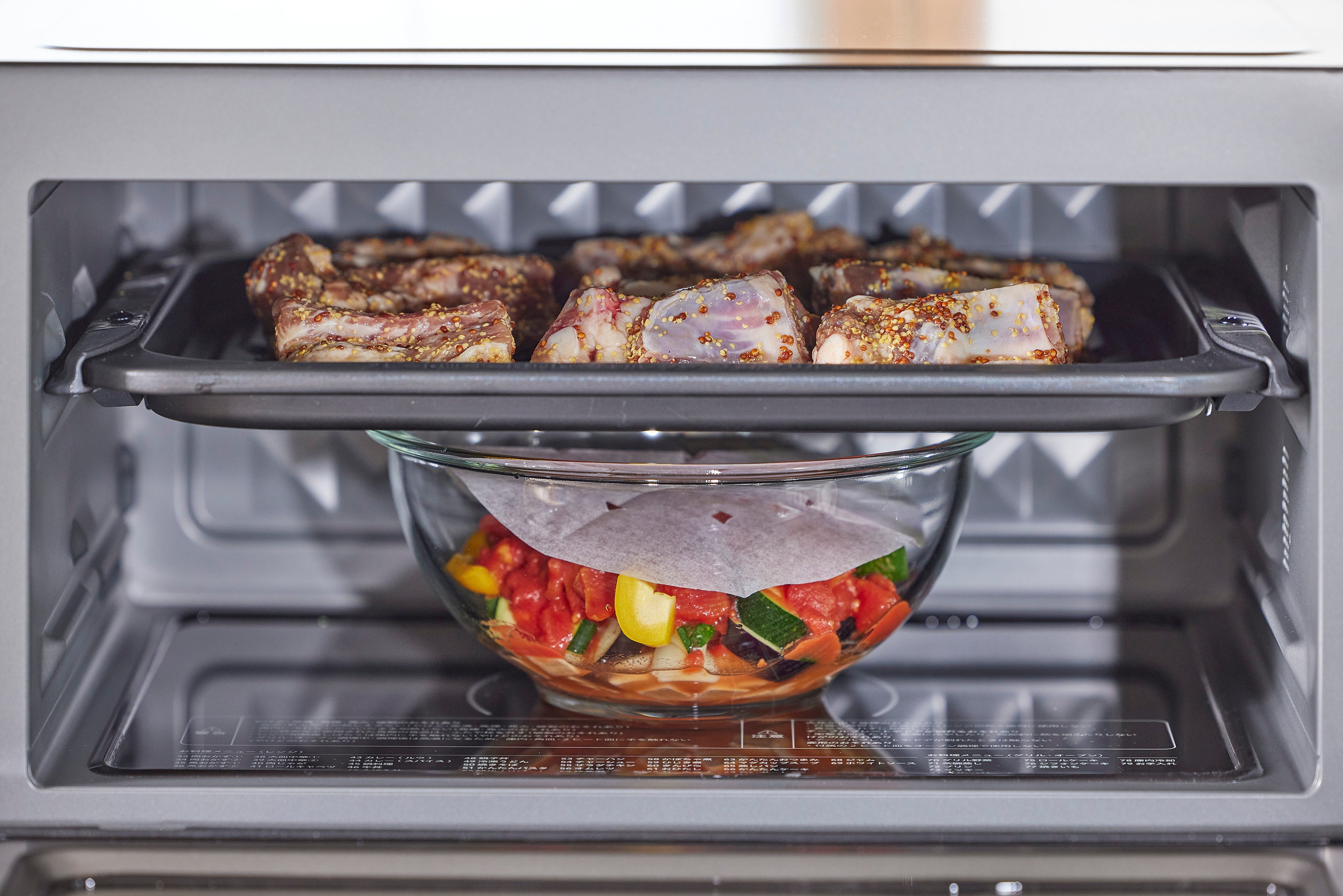 上段でグリル調理、下段で電子レンジ調理を同時に行う「2段調理」*3も可能です。2品を同時に調理することで、調理時間が時短に。「スペアリブのハニーマスタード焼き&ラタトゥイユ」、「白身魚の香草パン粉焼き&きのこと根菜のホットサラダ」の2種類のメニューの調理が可能です。