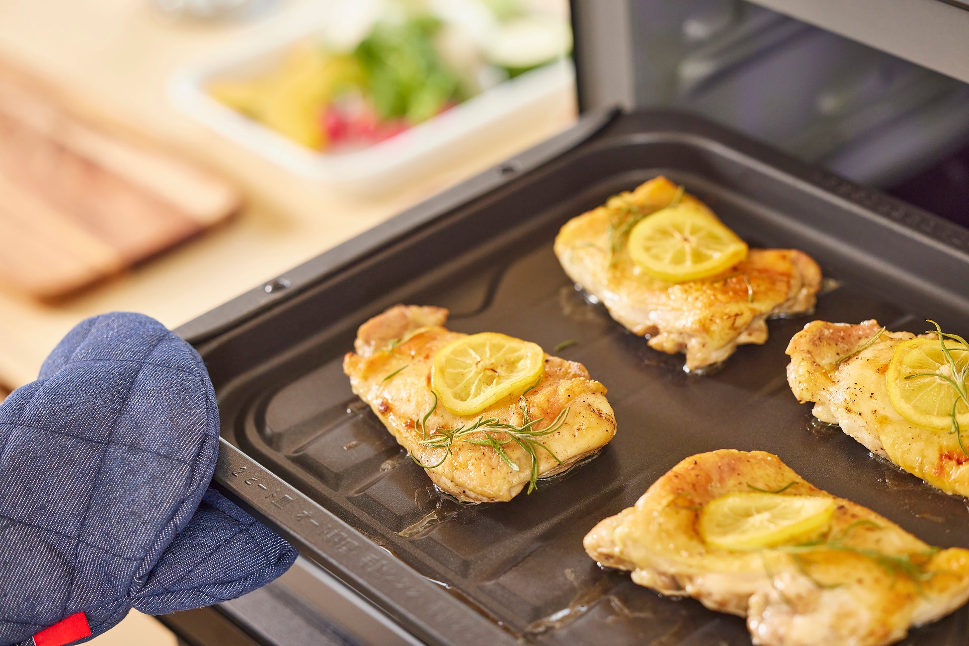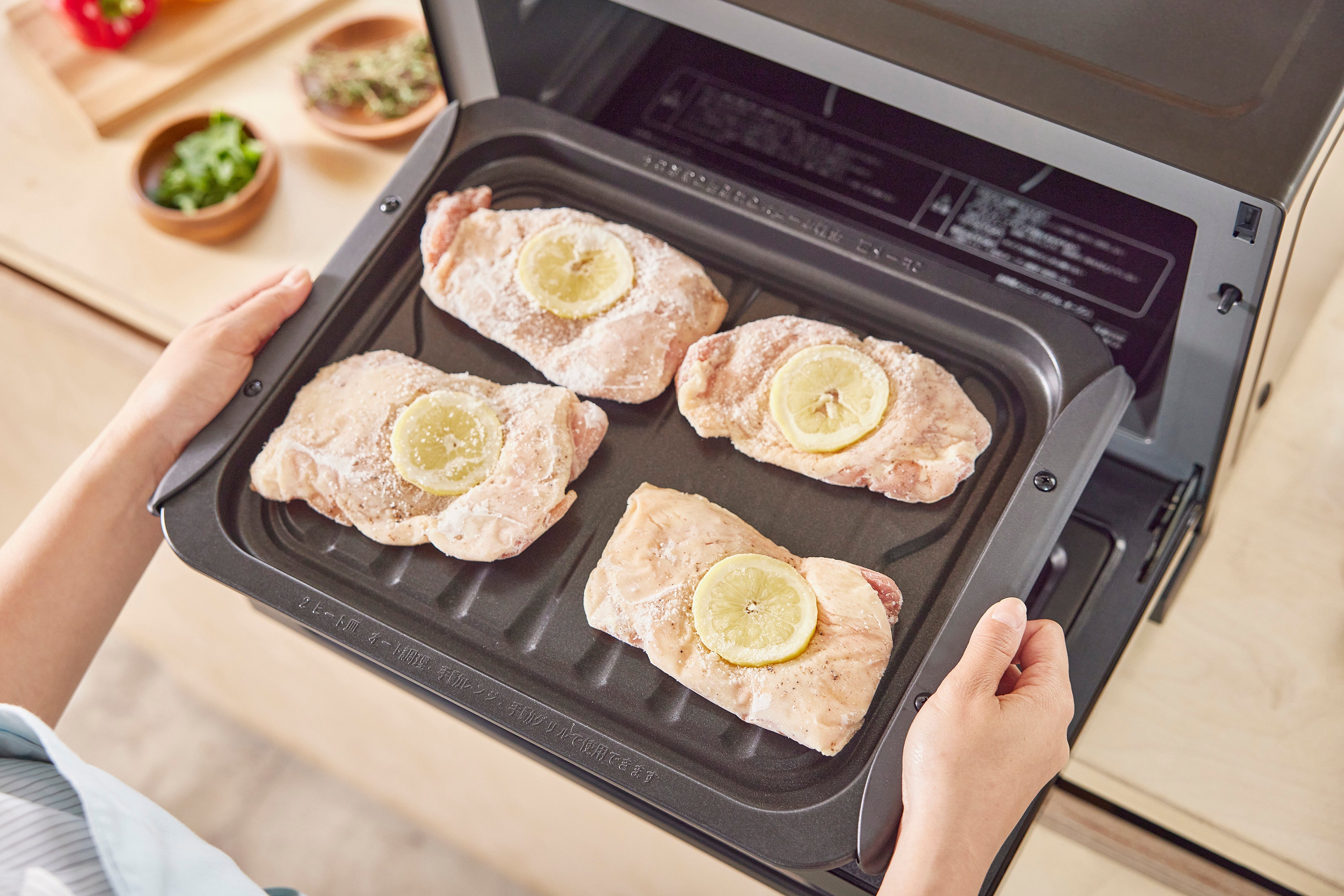 冷凍のチキンや切り身魚など、レンジで解凍・温めをしてからグリルで焼き色をつける、という工程が必要なものも、「2ヒート皿」を使えば事前に解凍する手間は必要ありません。ボタン一つで、解凍から焼き上げまでを一気に行います。*2