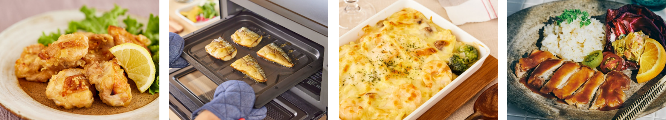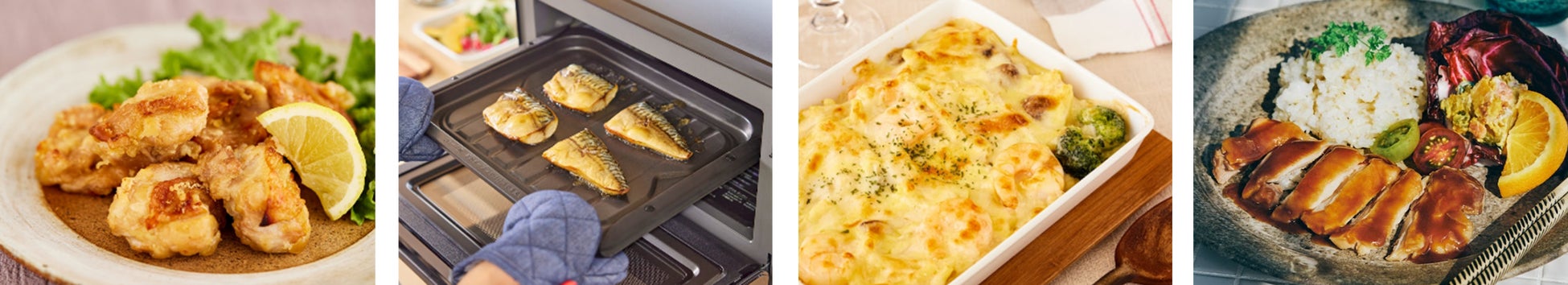 【画像左から】油で揚げないから揚げ/塩さば/グラタン/照り焼きチキン