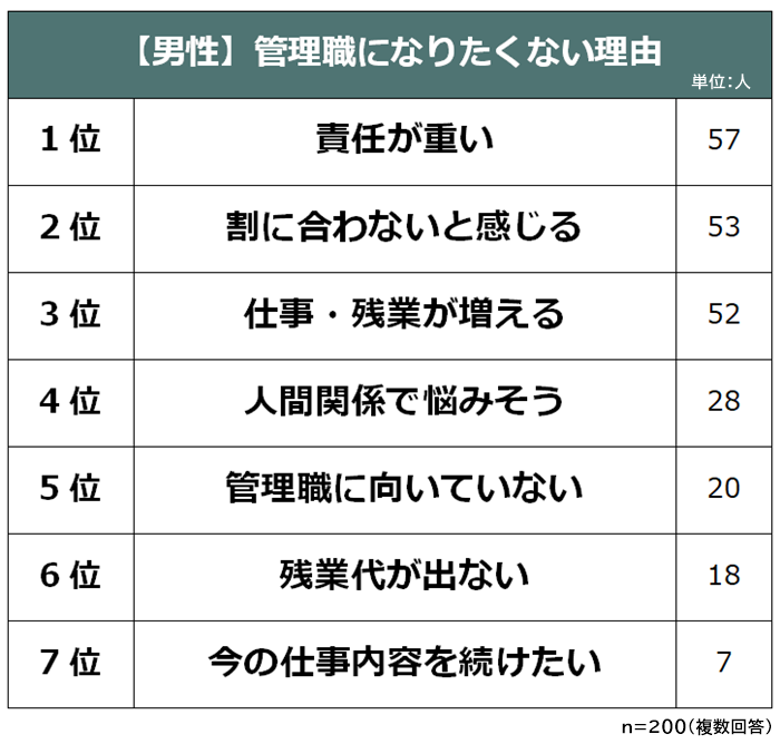 管理職になりたくない男性200名に「管理職になりたくない理由」を聞いたところ、1位は「責任が重い(57人)」でした。