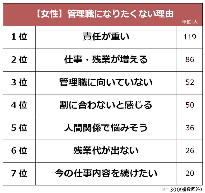 管理職になりたくない女性300名に「管理職になりたくない理由」を聞いたところ、1位は「責任が重い(119人)」でした。