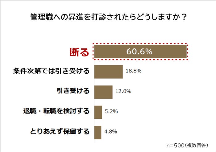 「管理職への昇進を打診されたらどうするか」を聞いたところ、1位は「断る(60.6%)」でした。