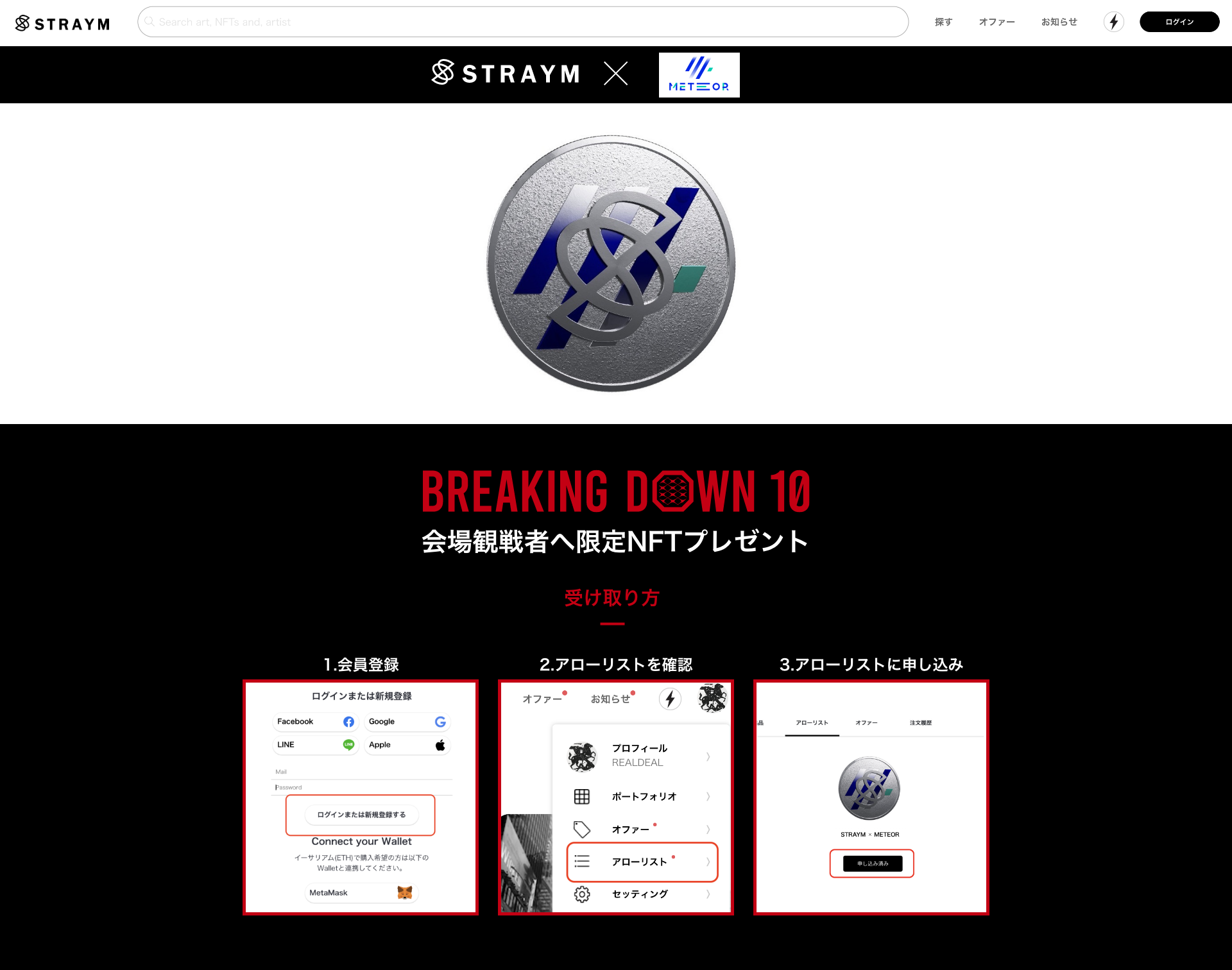 RWA「STRAYM (ストレイム)」を展開するストレイム アート アンド カルチャー株式会社 (本社: 東京都渋⾕区、代表取締役: ⻑崎幹広)は、2023年11月23日に開催される「BreakingDown10」の来場者に、プラチナスポンサーを務める”暗号通貨で人に可能性を拡げるプラットフォーム「METEOR」とのコラボレーション限定NFTを配布致します。
