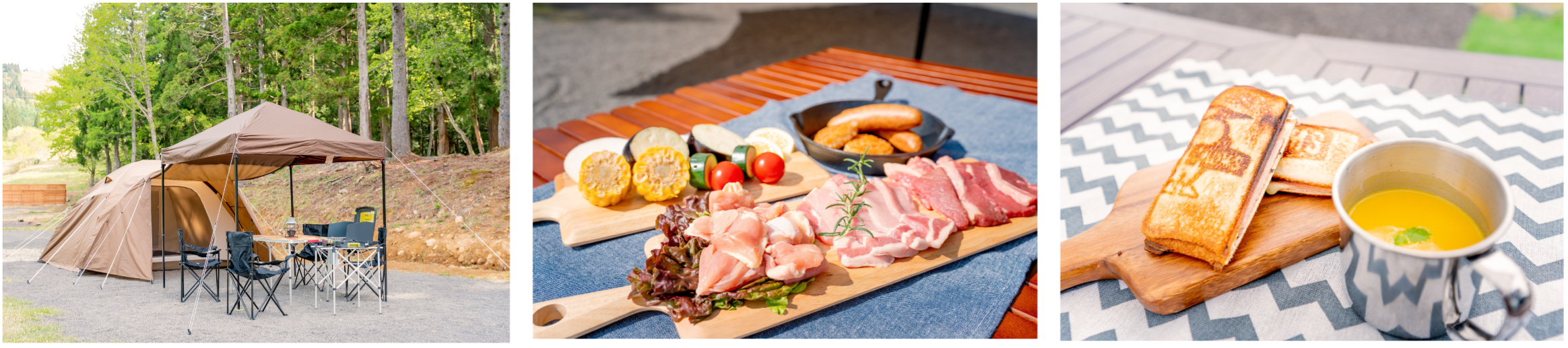 夕食・朝食付の手ぶらプランで何も気にせずキャンプを満喫!テント、タープ、フロアマット、シュラフ(人数分)、テーブル&チェア、ランタン、ハンディライト(人数分)、ガスコンロ(鉄板・ガス)、ホットサンドメーカー、食器類(1名につき1セット)、夕食(スタンダードBBQセット)、朝食(ホットサンド、スープ)付