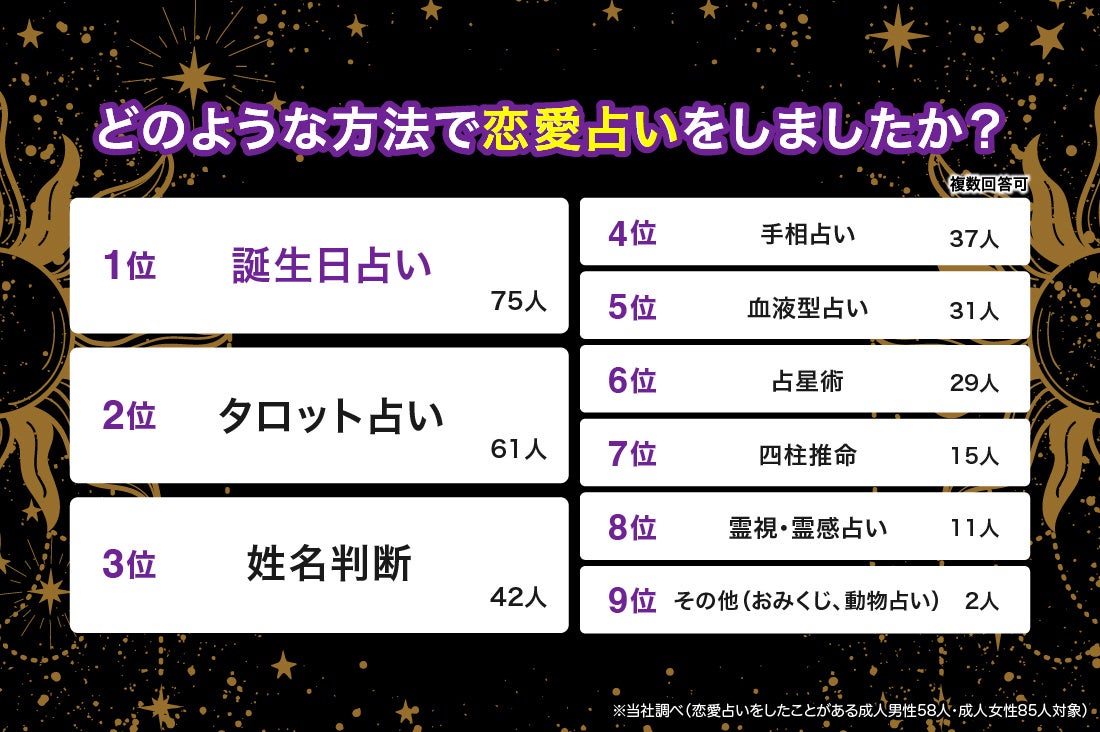 恋愛占いをしたことがある成人男女に、どのような方法を試したか尋ねたところ、最も多かったのは「誕生日占い」でした。