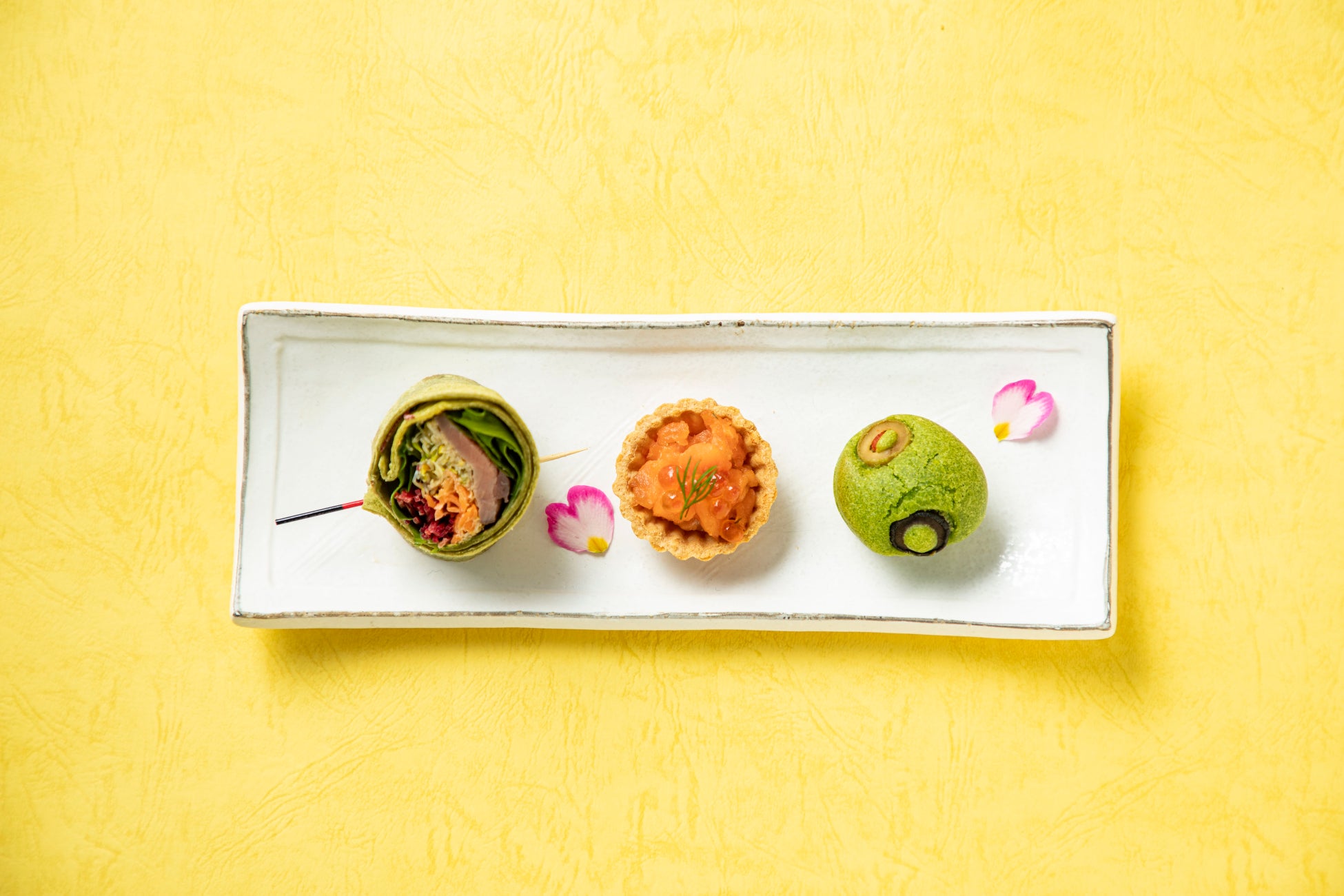 上品な甘さの抹茶ティラミスやサブレシュークリーム、みたらし豆乳プリンなど、全9品の和風スイーツと新緑感じる3品のセイボリーが織りなす新たな出会い