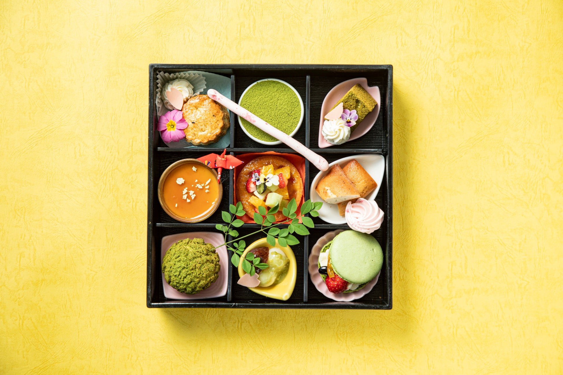 一段の升重には、抹茶のティラミスや抹茶のサブレシュークリーム、みたらし餡がアクセントの豆乳プリン、ホテルメイドの獅子柚子のジャムを使ったタルトやマカロンなど9種類の和テイストスイーツ、別皿には春ならではのサクラマスのタルトなど3種類のセイボリーが華やかさを演出。