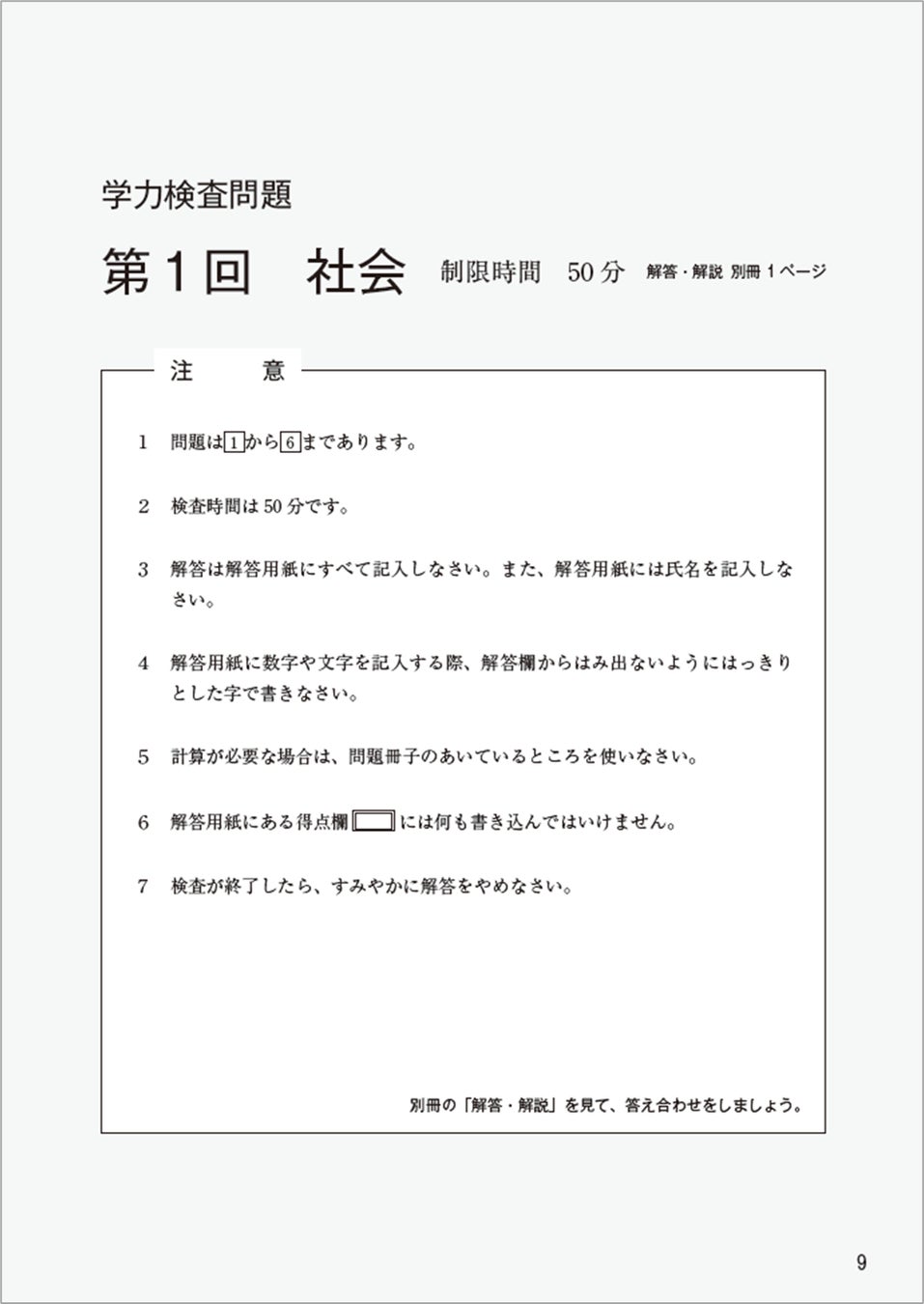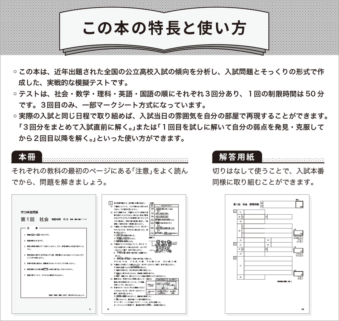 この本は、近年出題された全国の公立高校入試の傾向を分析し、入試問題とそっくりの形式で作成した、実戦的な模擬テストです。テストは、社会・数学・理科・英語・国語の順にそれぞれ3回分あり、