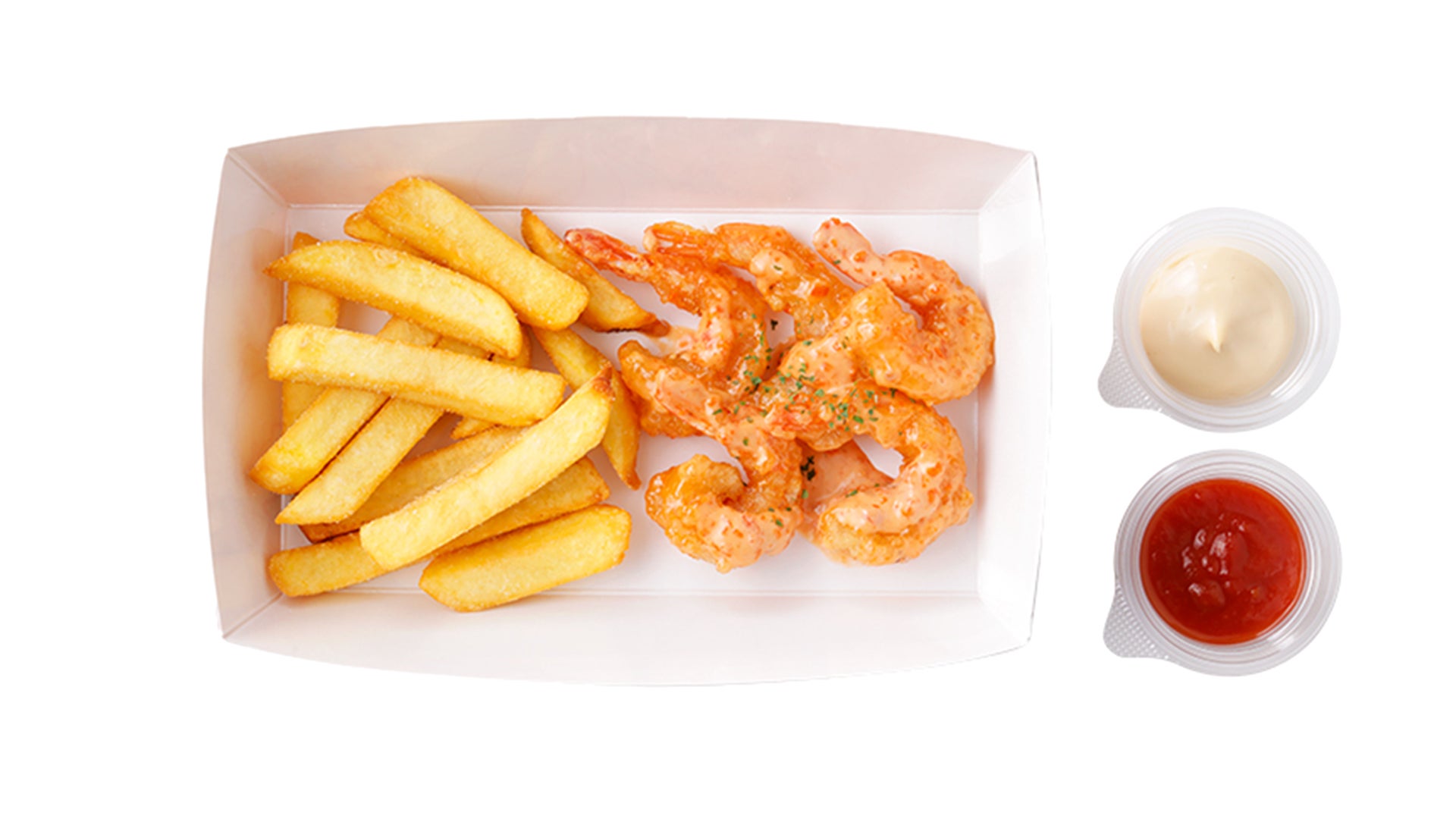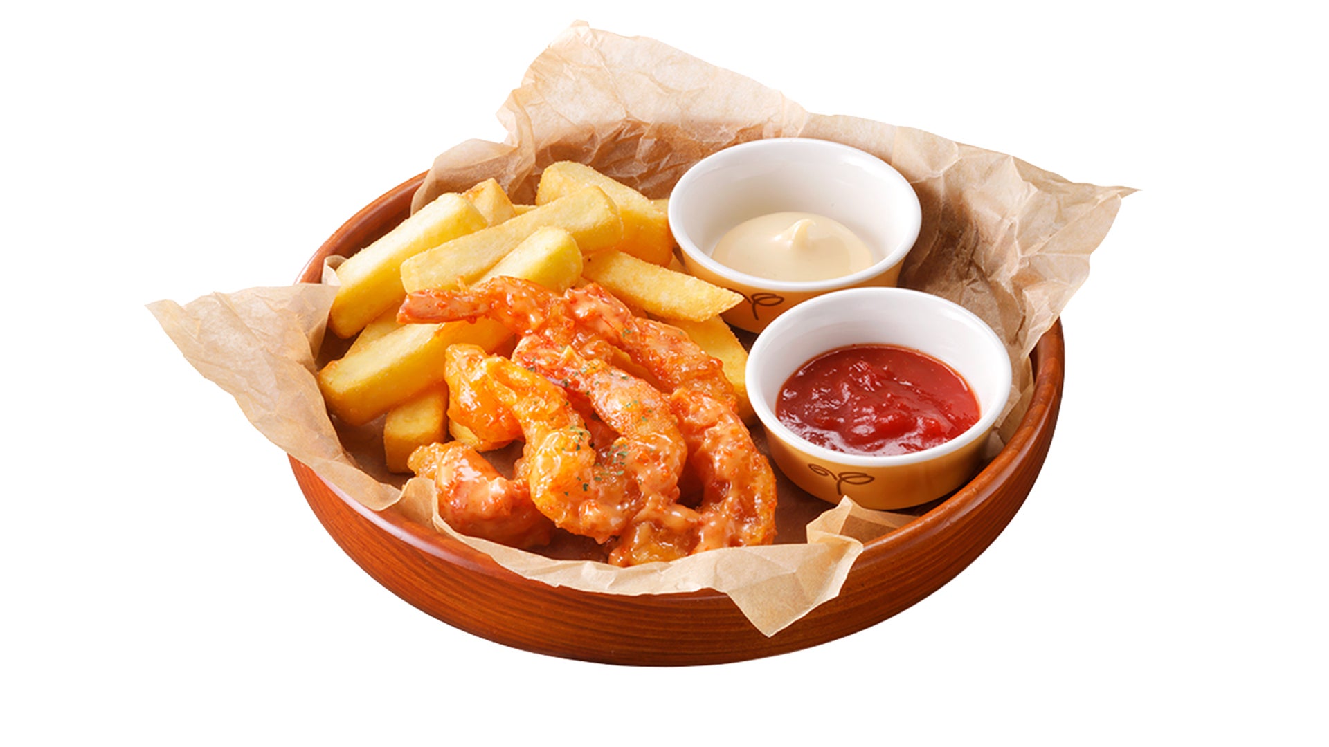 マヨネーズとトマトソースを合わせたオリジナルのオーロラソースで和えるシュリンプとフライドポテトはやみつきになる味わいです。定番のトマトソースとオリジナルマヨネーズタイプもお好みで。