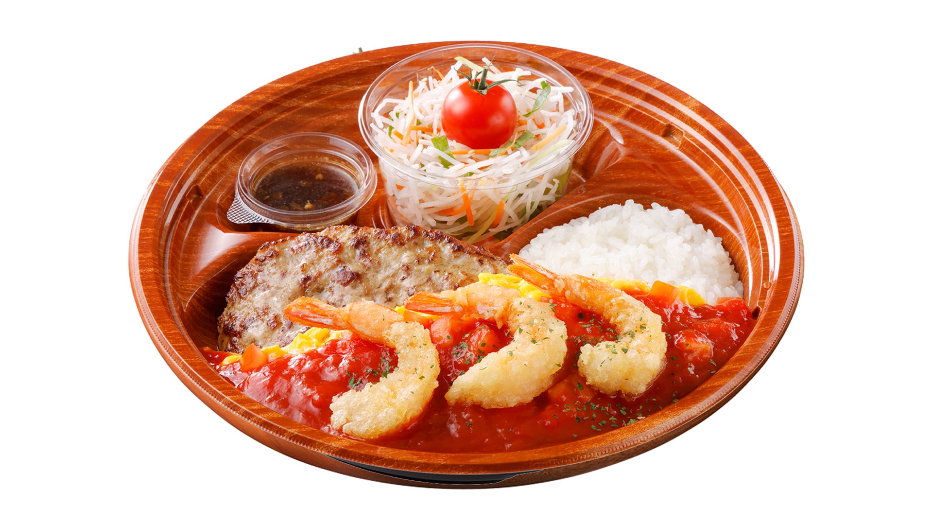「角切りトマトのオムバーグディッシュ」にプリプリ食感のシュリンプフリットを乗せた、新しい一品。相性抜群なハンバーグソースとトマトソースにたっぷり絡めてお召し上がりください。