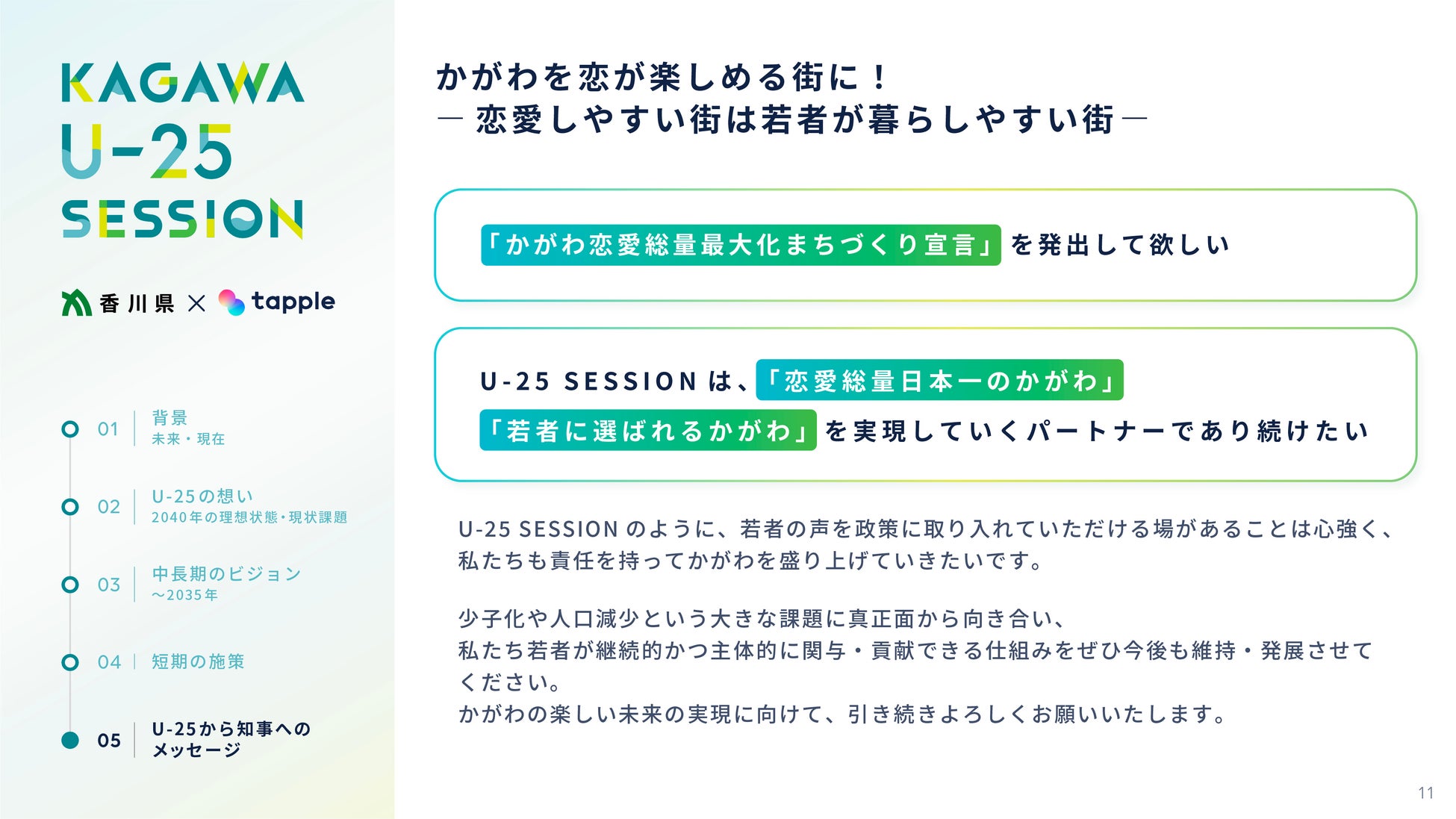 株式会社タップル(本社:東京都渋谷区、代表取締役社長:平松 繁和、以下「タップル」)は、香川県と締結した「出会い・恋愛・結婚応援に関する連携協定」に基づき、香川県内の若い世代を集めたコミュニティである「KAGAWA U-25 SESSION」をサポートしてきました。このたび、2025年9月5日(金)に香川県庁にて行われた第4回目の「KAGAWA U-25 SESSION」において、香川県の「恋愛総量最大化」に向けた提言が取りまとめられ、知事に提出されました。