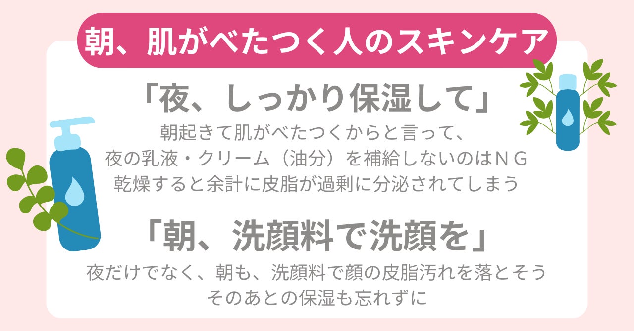 寝起きの肌のべたつきが気になる人に、スキンケアのポイントを紹介します。