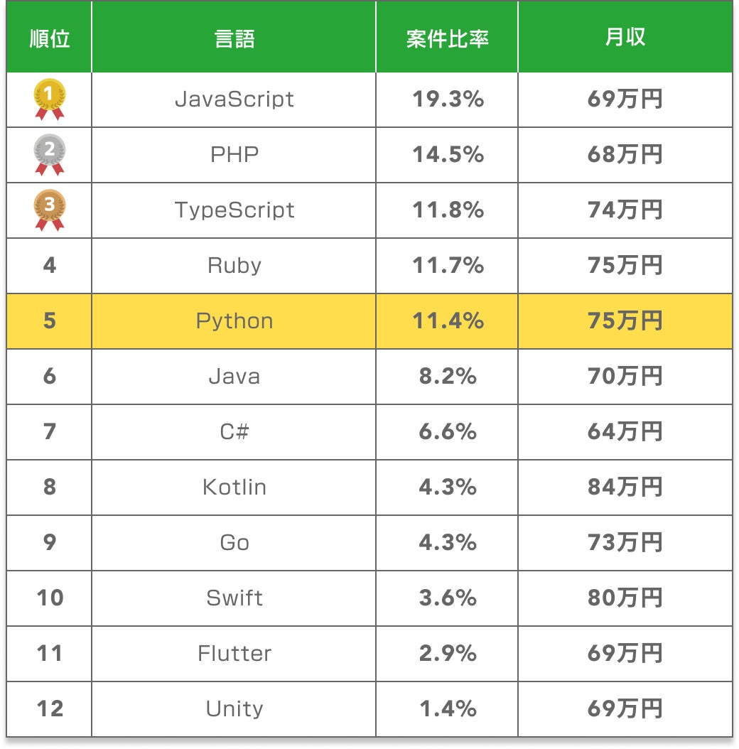 Pythonの案件はIT市場全体の11.4%を占めており、案件数ランキングでは5位にランクインしています。この数字は、Pythonがウェブ開発、データ分析、AI開発など幅広い分野で活用されている証拠と言えるでしょう。需要の高さから、Pythonスキルを持つエンジニアは継続的に案件を獲得できる可能性が高いと考えられます。