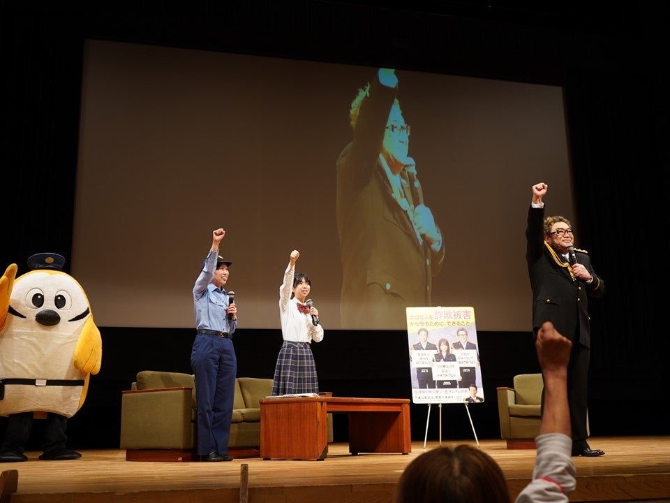 最後に、会場全体で特殊詐欺に関するクイズを出題、特殊詐欺に対する注意点と理解を深めたのち、「特殊詐欺、撲滅するぞ!」と宣言を行い講演を終了しました。