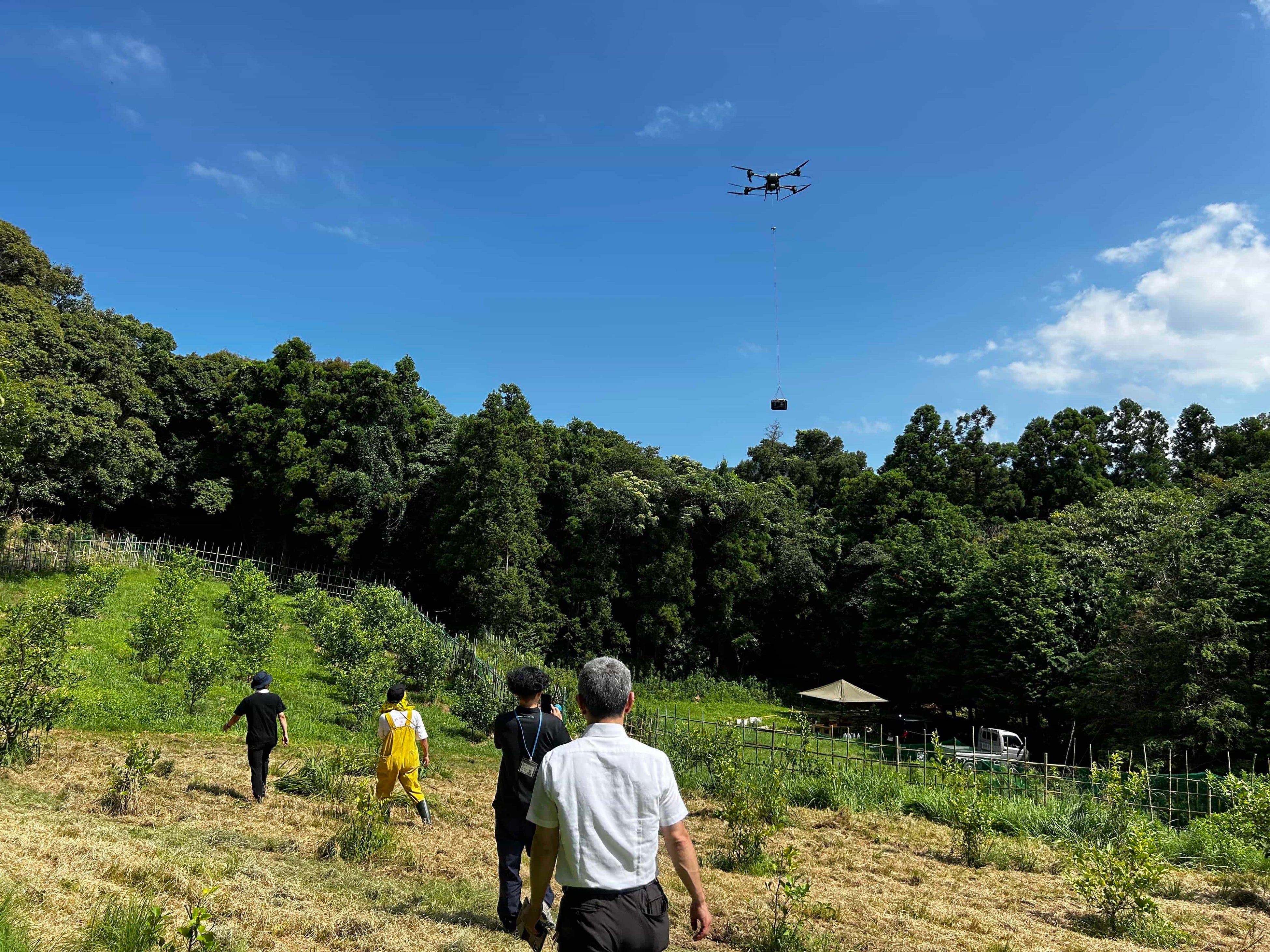 この実験には下関市役所の職員も見学に訪れ、ドローンが農業だけでなく災害対応や物流配送にも有効であることをアピール。当日は気温が35度を超える真夏の炎天下で、ドローンが軽々と肥料の搬送を行い、ウィンチシステムを活用することで、配送地点に着陸せずに肥料を届けることができました。