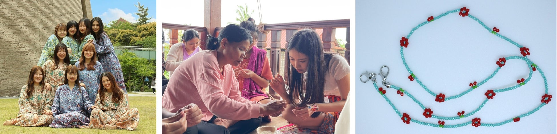 【金城学院大学「DIAGIRL」】今年3年ぶりに渡航!学生とカンボジアの女性が一緒に創りあげるアクセサリー日本とカンボジアの女のコが一緒に学び、成長し、誰かの役に立つ幸せの連鎖を世界に広げていくことを目指している。7月末にはカンボジアへ渡航し、現地の女のコたちと当催事で販売するアクセサリーを製作。その収益はカンボジアの女のコにお給料として還元される。