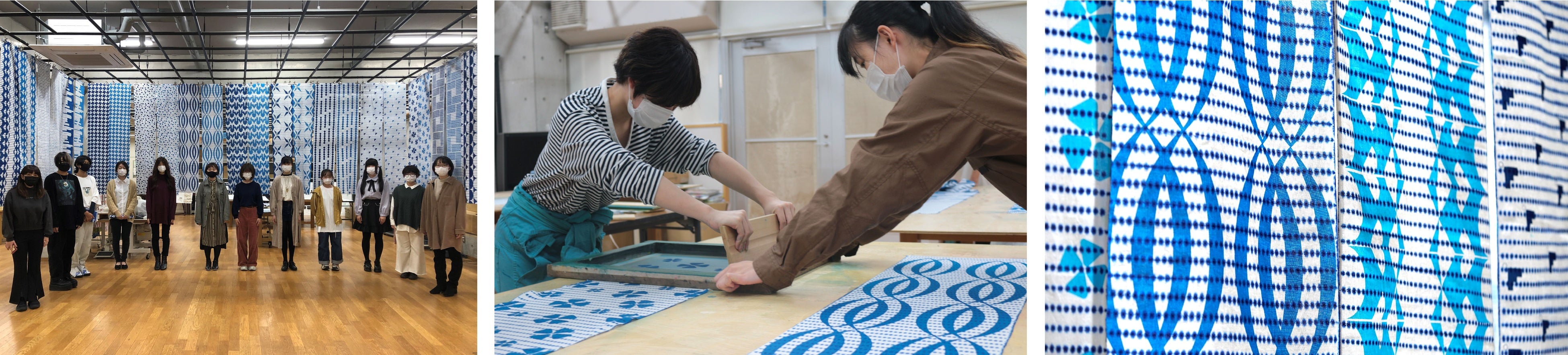 テキスタイルデザインを学ぶ学生が、愛知県の伝統産地と組み、使われない素材のアップサイクルを研究。難点があり販売できない「豆絞り」の手ぬぐいに学生が柄をデザインし、シルクスクリーンプリントで加工、新しい商品として販売。