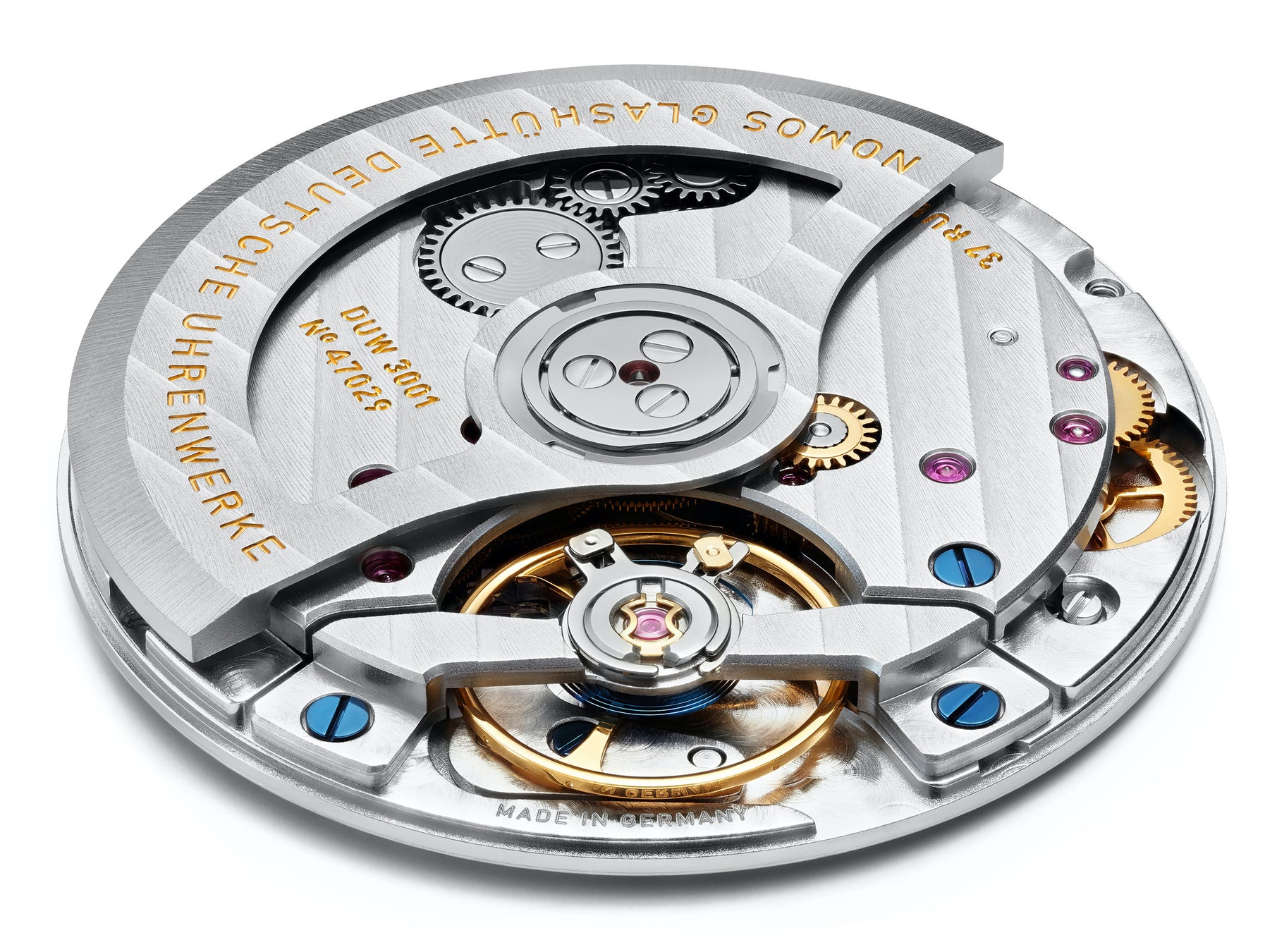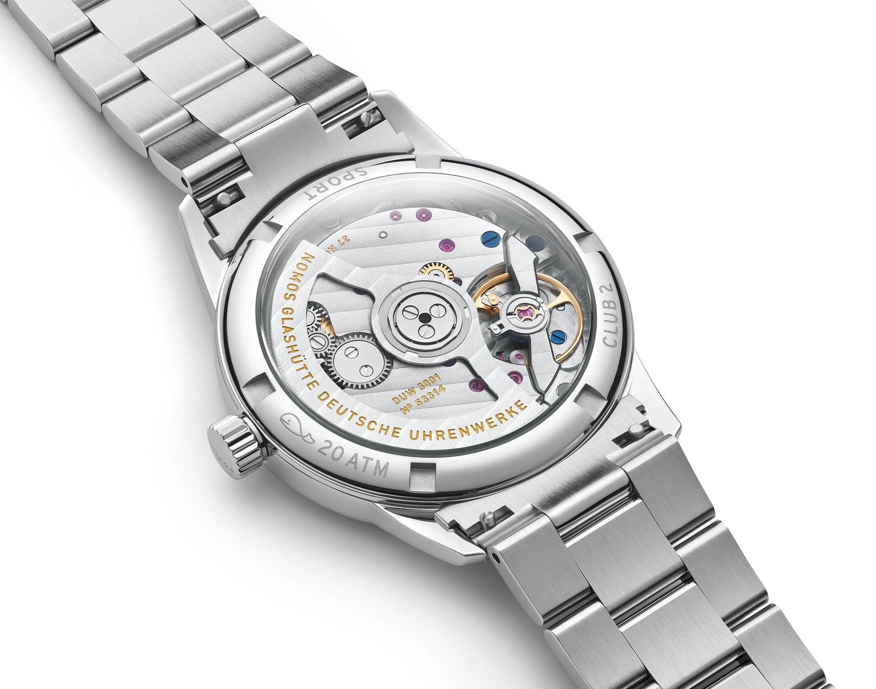 クラブスポーツシリーズの内部で時を刻むのは、グラスヒュッテにて手作業で作られている自動巻きキャリバーDUW3001。両方向巻き上げローターに青ヒゲゼンマイが特徴的な自社製のノモススウィングシステムにDUW緩急システムを備えています。