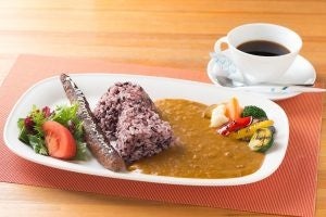 行田産の古代米を使った古墳カレー!鉄剣に見立てたハンバーグと地元野菜と古墳がコラボした、ここでしか出会えないカレーです(コーヒー付)