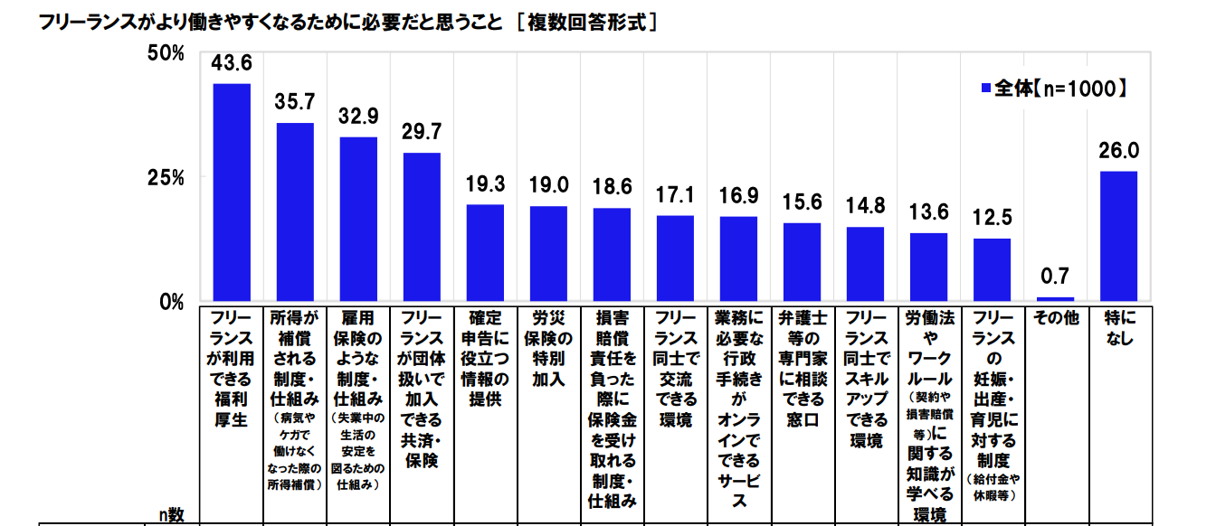 フリーランスとして働く人1000人を対象に行った調査では、「フリーランスがより働きやすくなるために必要だと思うこと」についての質問に対し、「フリーランスが利用できる福利厚生」「所得が補償される制度・仕組み(病気やケガで働けなくなった際の所得補償)」「雇用保険のような制度・仕組み(失業中の生活の安定を図るための仕組み)」と回答されており、フリーランスが安心して働くことのできる補償制度、環境作りは喫緊の課題となっています。