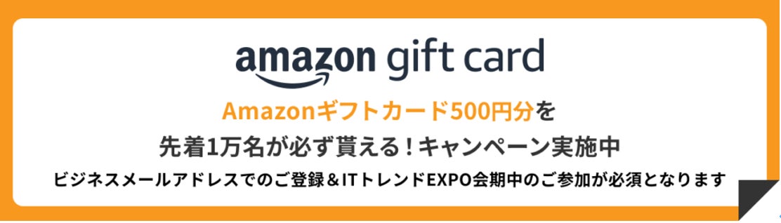 ITトレンドEXPO2025 Summerでは、 Amazonギフトカード500円分をもれなくプレゼントするキャンペーンを実施中です。 下記URLよりビジネスメールアドレスを利用して登録し、会期中に参加した場合、先着1万名にAmazonギフトカードがプレゼントされます。