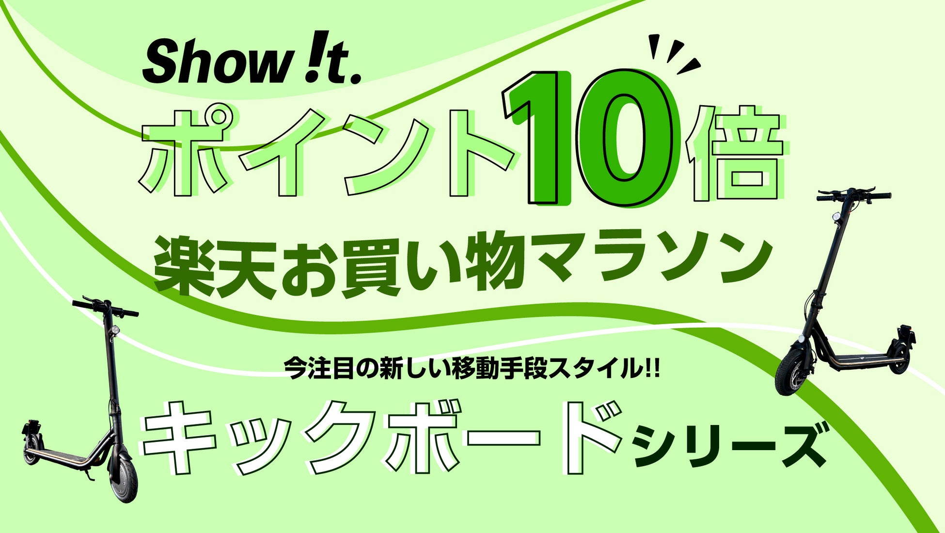 楽天市場「Show !t」はポイント最大10倍プレゼントを実施し、3月21日20:00~3月28日01:59まで開催される、楽天お買い物マラソンに参加します。キャンペーン期間中、規制緩和で今話題の電動キックボードを届いたらすぐ乗れるヘルメットと輪行バックもセットで、数量限定 税込み39,800 円で販売致します。