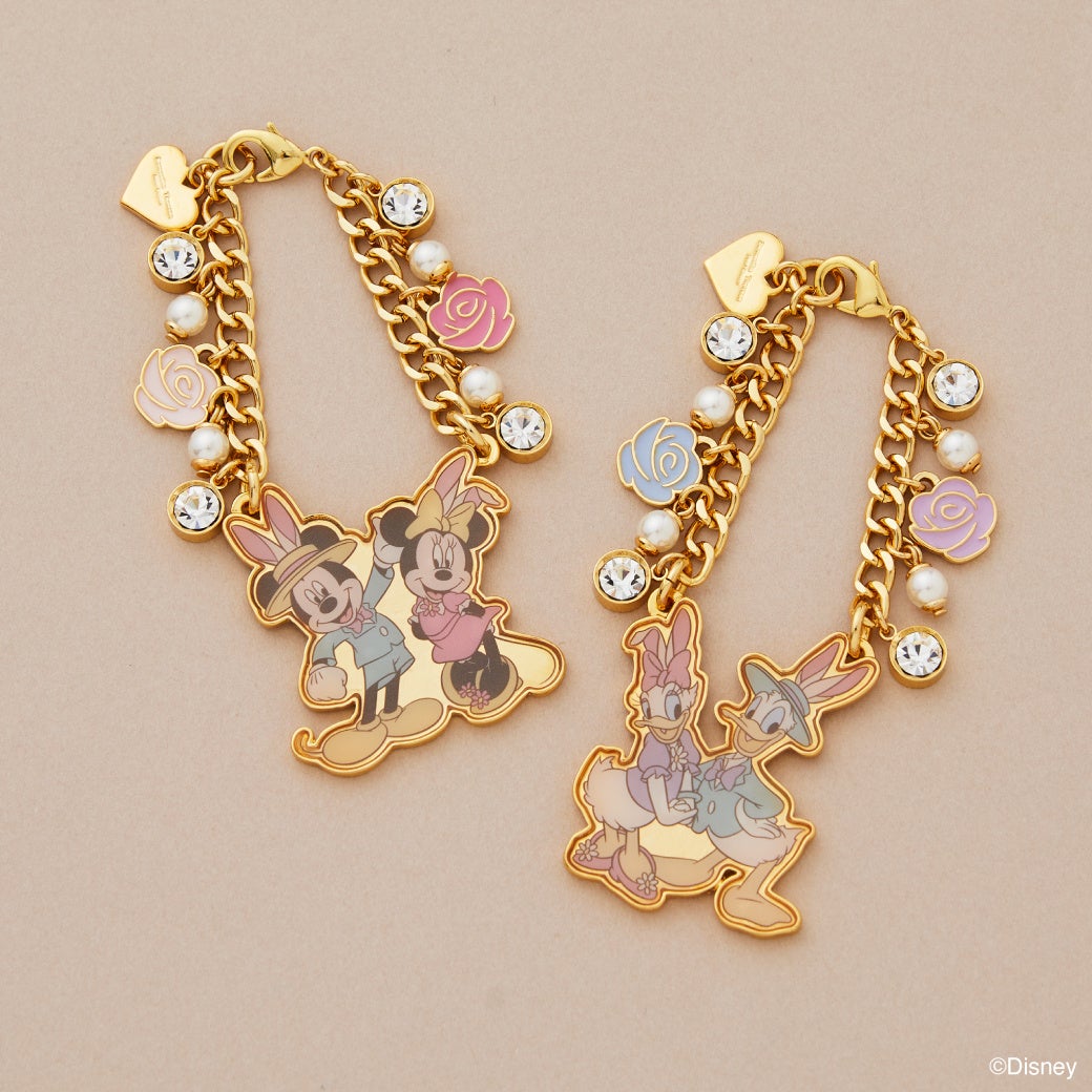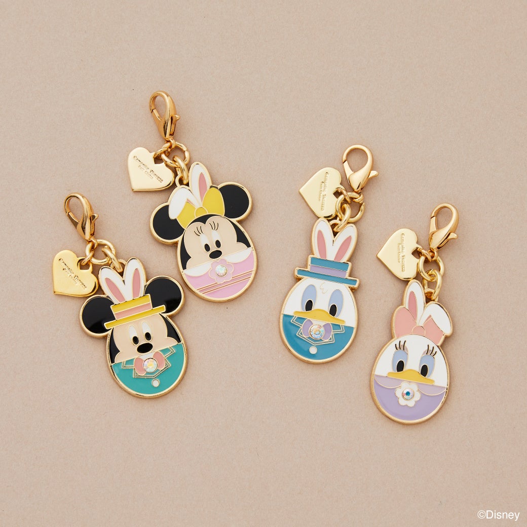 「ミッキーマウス」と「ミニーマウス」、「ドナルドダック」と「デイジーダック」がイースターバニーの耳をつけた姿をしている様子がキュート。チェーンの部分にはカラフルなバラのモチーフやパール、ビジューのデザインが。