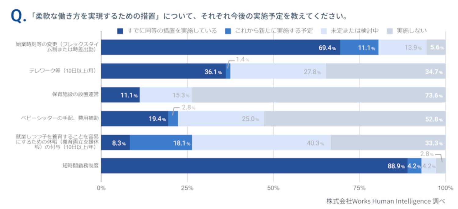 特に「短時間勤務制度」と「始業時刻等の変更(フレックスタイム制または時差出勤)」の実施率が高い結果となりました。短時間勤務制度については、育児介護休業法で3歳未満の子を養育する労働者に対して義務化されているため、3歳以降の子において実施している企業も多いと考えられます。